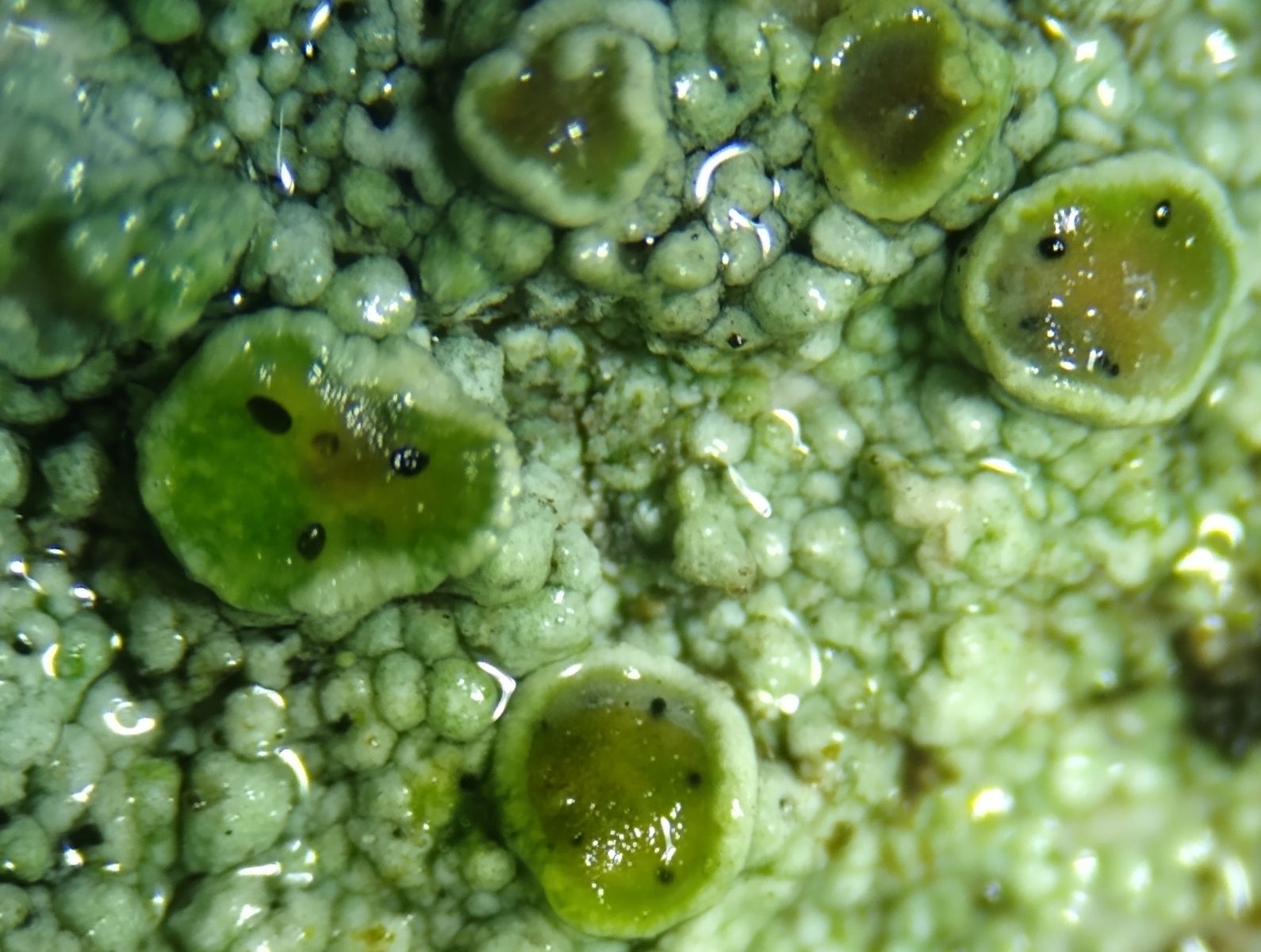 eben entdecke ich beim Sichten meiner heutige aufgenommemen Fotos eine ungewöhnliche Krustenflechte.