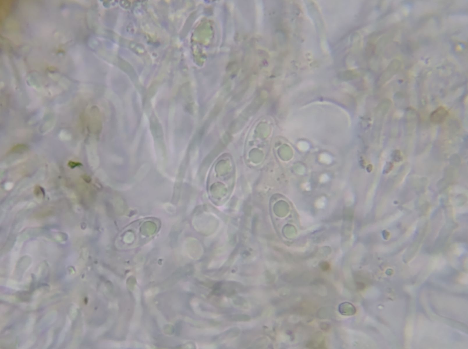 Sporen 1-zellig, spindelförmig mit 2 großen Tropfen / Abmessungen: 11-11,5 x 5-5,5 µm etwas klein, aber vermutlich nicht vollständig reife Sporen, da durch Quetschen aus Schläuchen befreit.