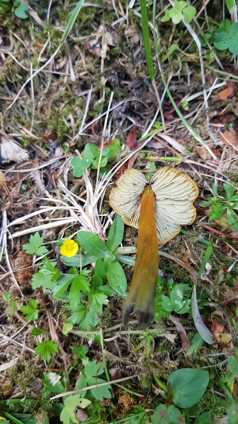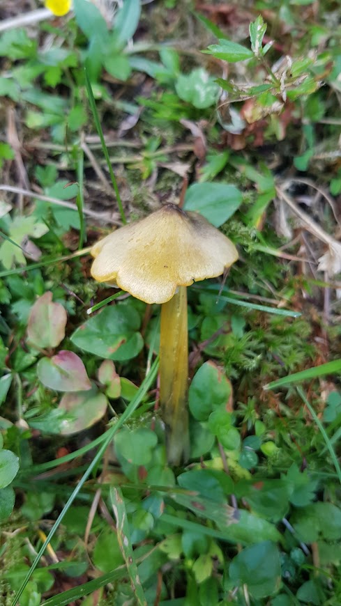 Die folgenden Pilze halte ich für Saftlinge, bin mir aber nicht sicher, welche Art das sein könnte. Gefunden habe ich sie auf einem Grasstreifen am Rande eines Waldweges