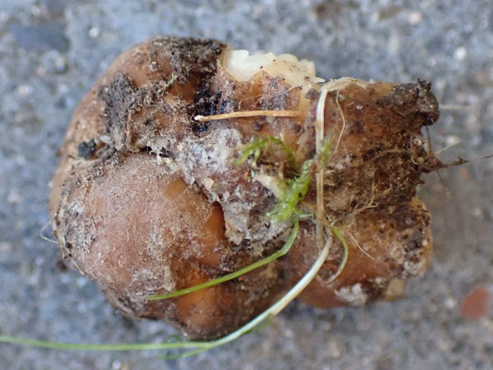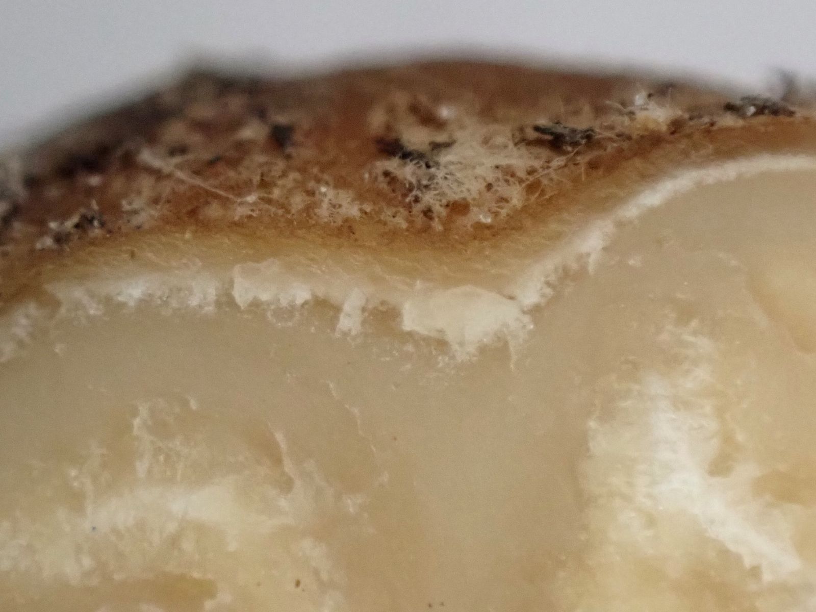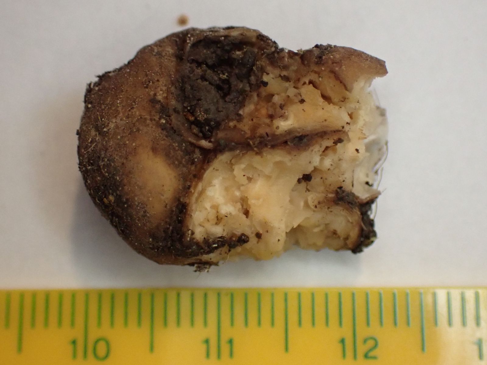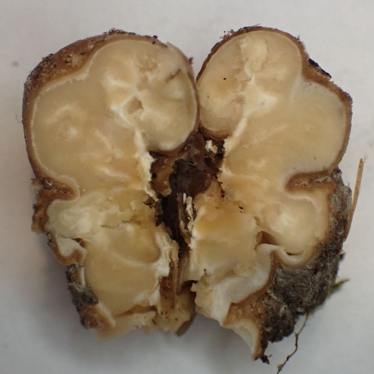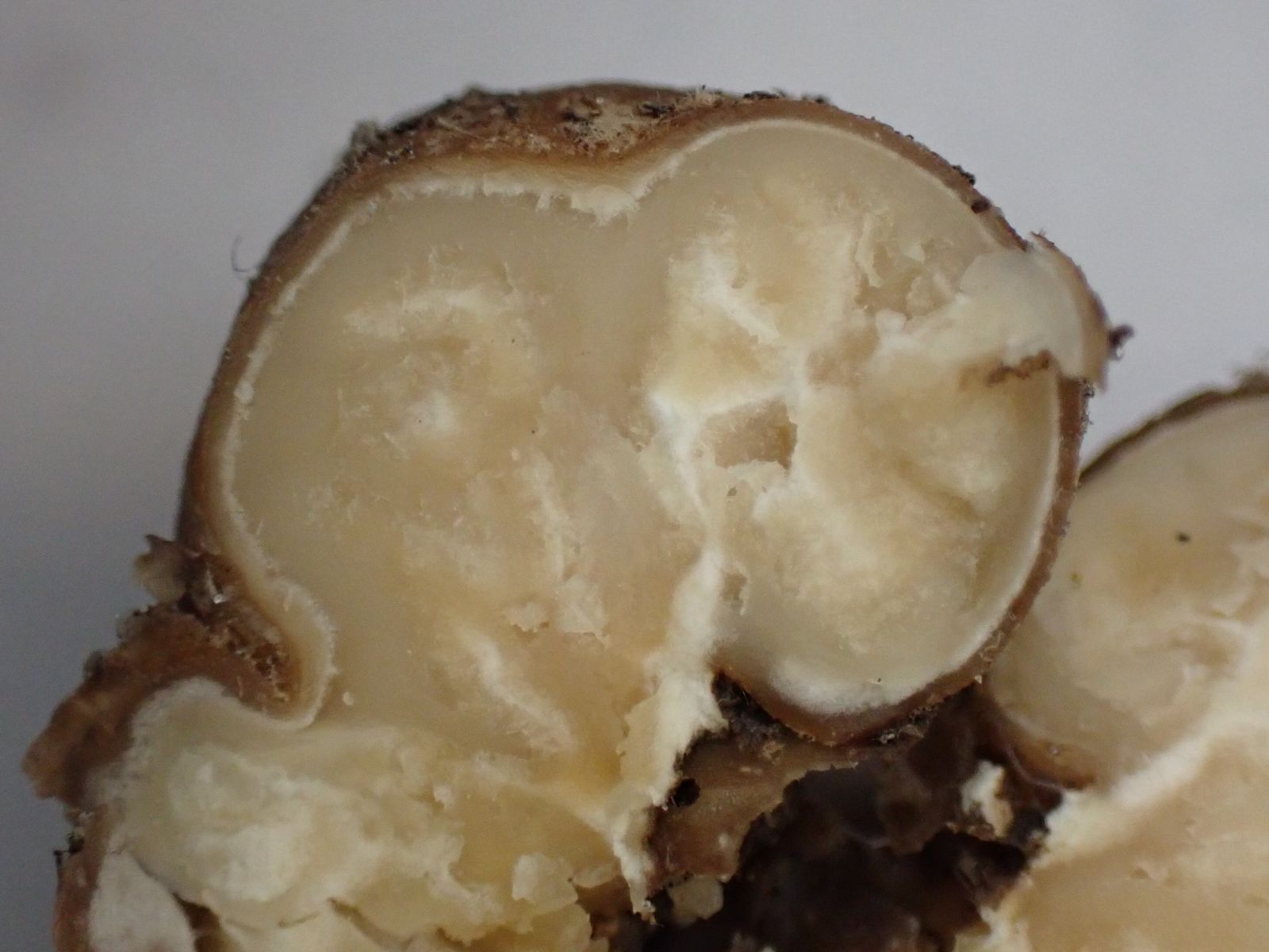 Die Innenseite sieht mir sehr unstrukturiert aus; so erinnert es mich an einen kleinen unreifen weißen Trüffel T. rapaeodorum, T. maculatum, T.dryophilum, T. puberulum oder T. foetidum.