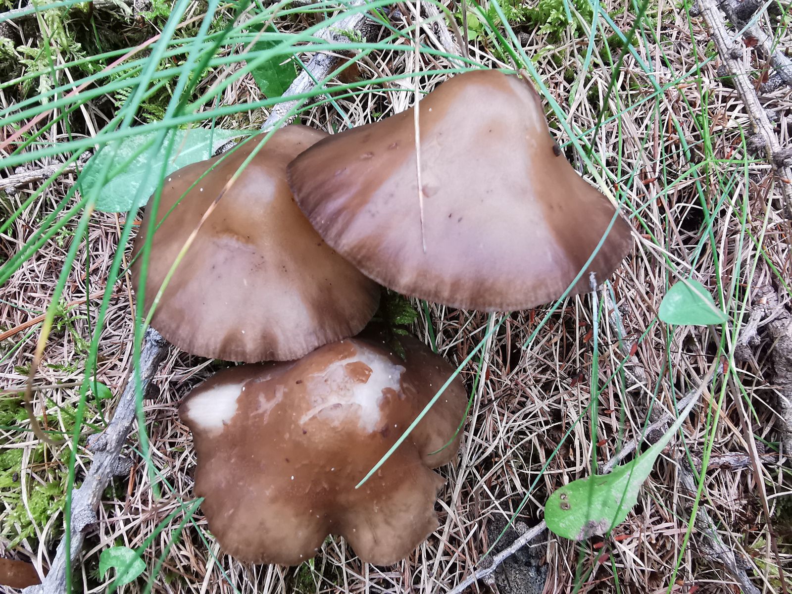 Ich war vorhin spazieren und eigentlich nicht auf der Suche nach Pilzen, aber da ich gleich neben dem Weg zwei Pilze erblickte, wollte ich sie mir natürlich trotzdem ansehen. Gewachsen sind sie auf etwa 1850m ü.M. neben einer Arve und einer Lärche. Da bei uns immer noch Schonzeit ist, wollte ich keinen der FK entfernen und konnte daher nur oberflächlich daran riechen. Ich konnte allerdings bei beiden Pilzen keinen Geruch wahrnehmen. Zudem bin ich mir nicht sicher, ob die Pilze auf Erde oder vergrabenem Holz wachsen.