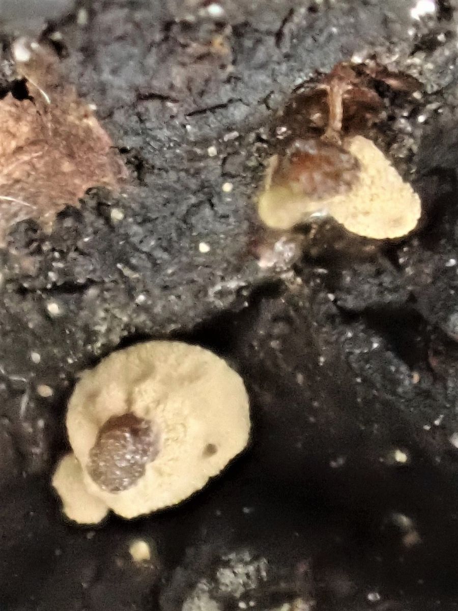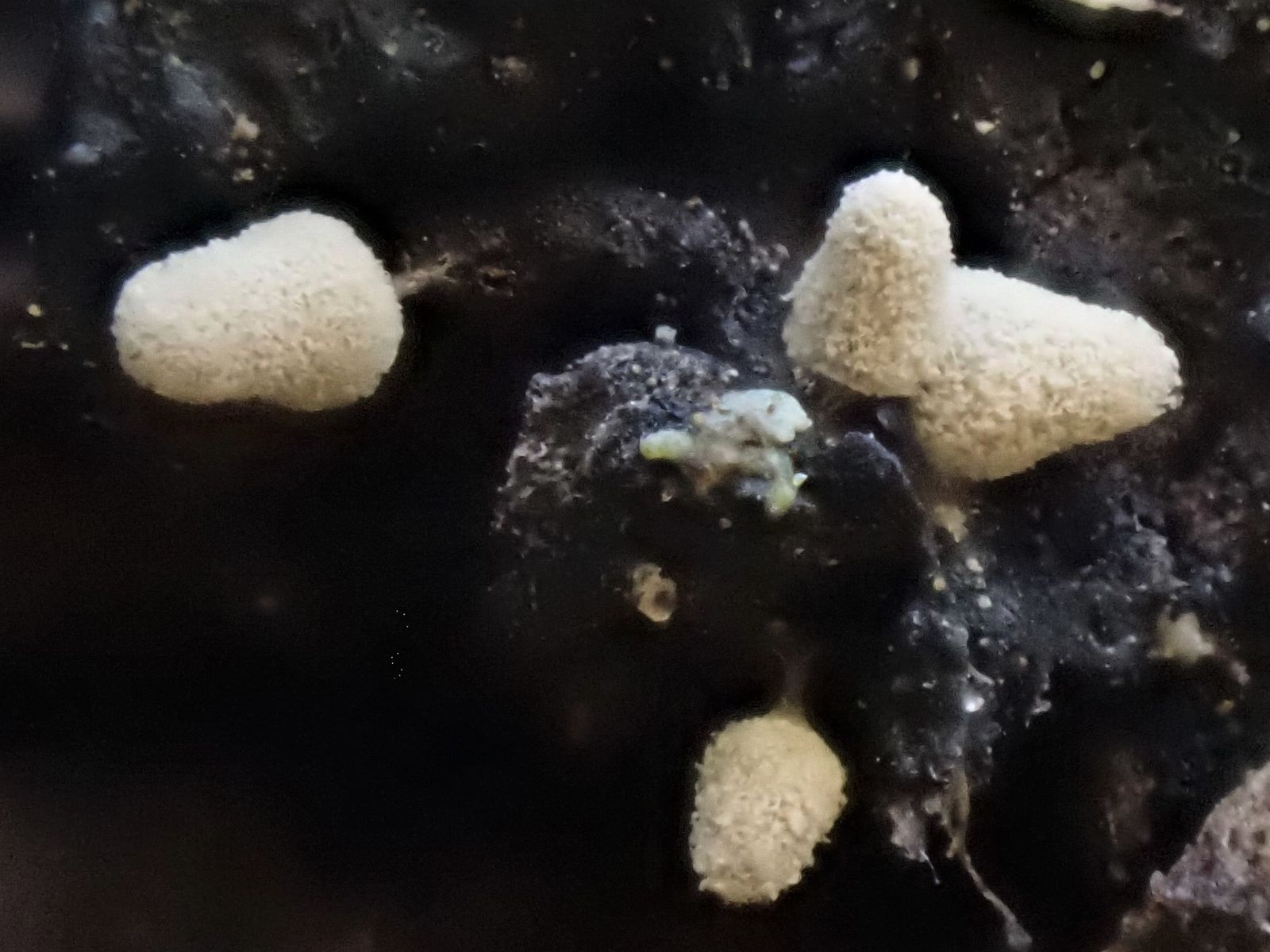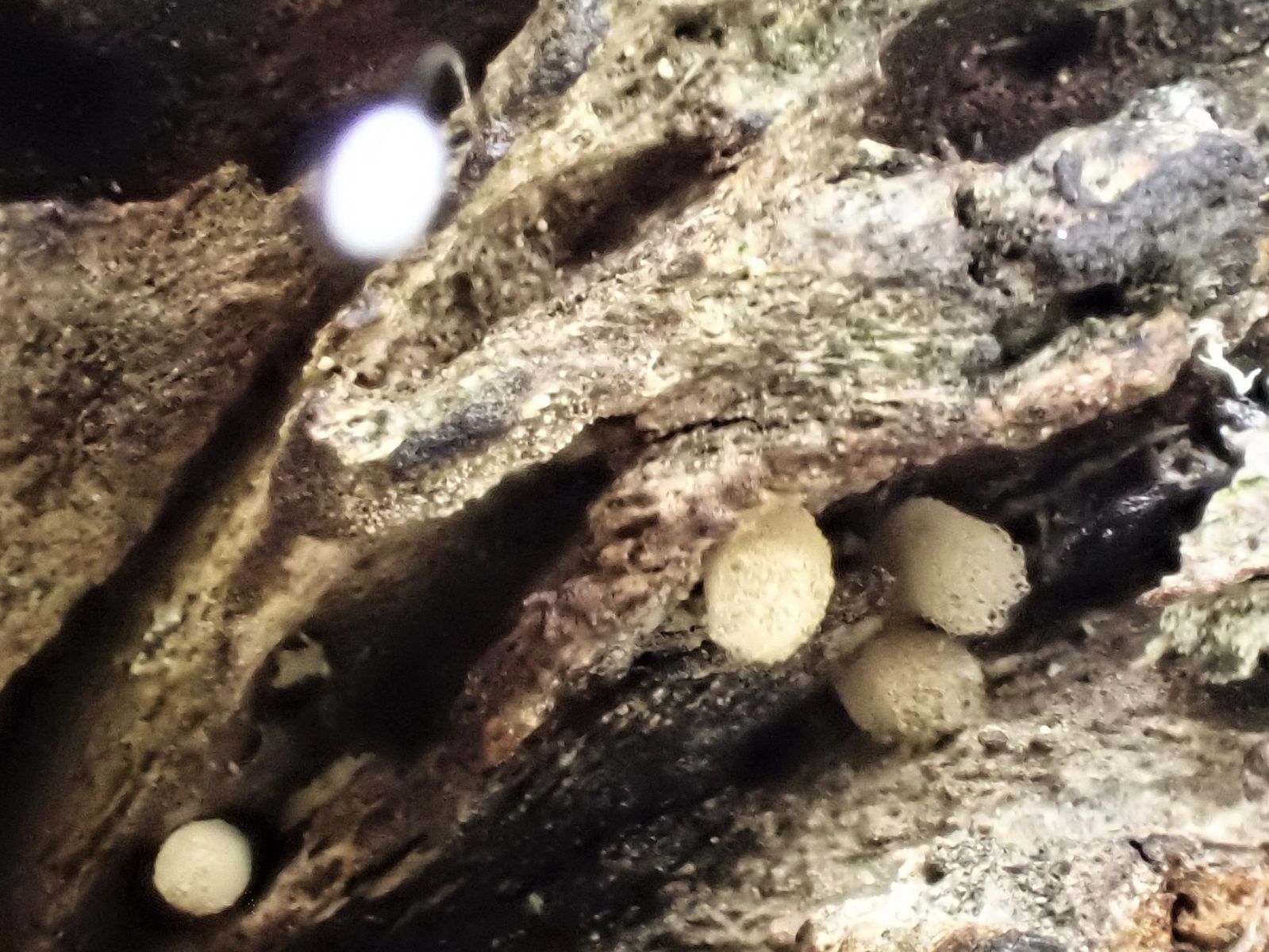diesen Schleimpilz habe ich an der Unterseite von einem toten Ast gefunden, der schon länger im Garten liegt.