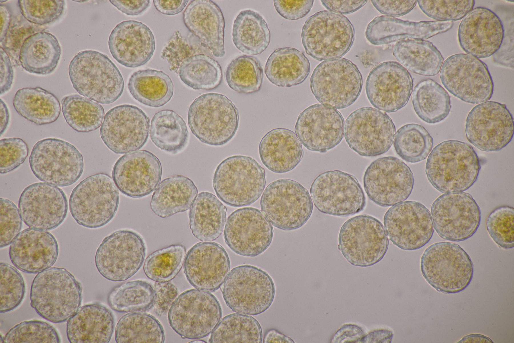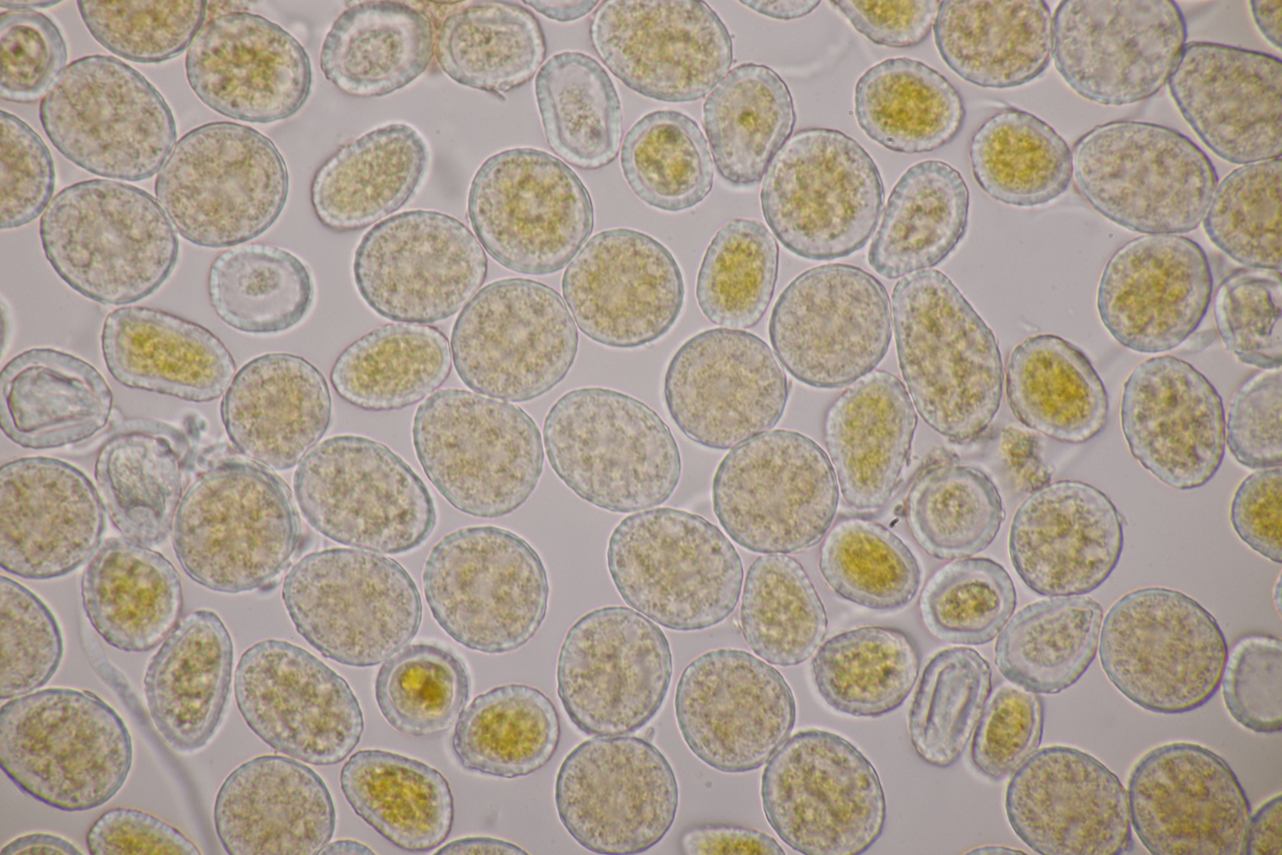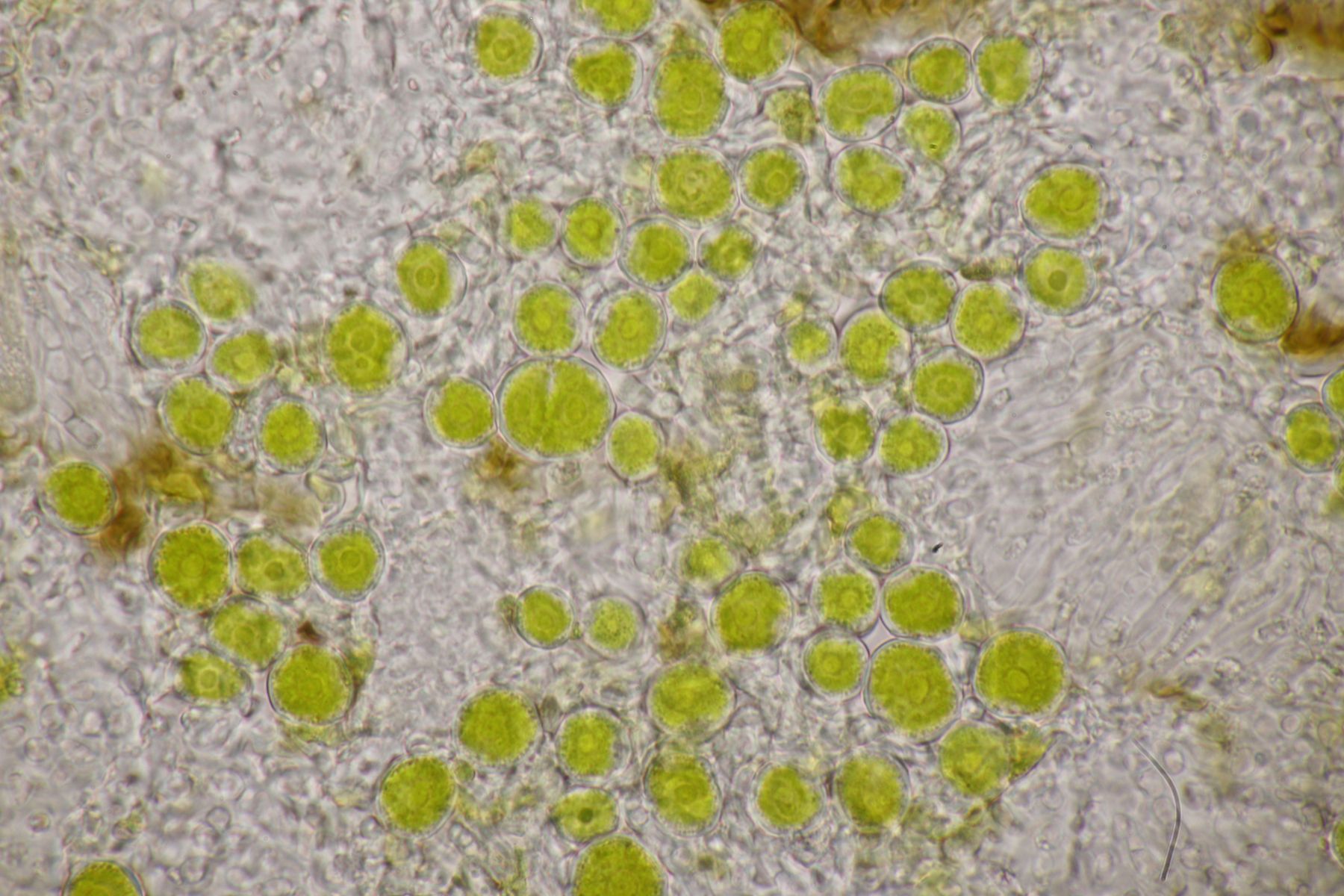2. Lobothallia kann ich glaube ich ausschließen: Ich hatte einige Krümel eingesammelt und tatsächlich bis nach Hause bekommen. Unter dem Mikro dann braune, zweizellige Sporen, die besser zu Dimelaena oreina passen: