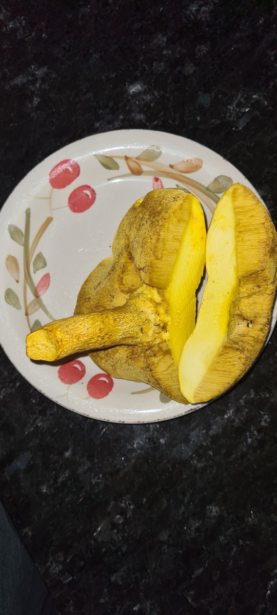 ich denke auch an den Goldröhrling, der Ring ist ja nicht kräftig ausgebildet und kann bei so alten Exemplaren auch Mal weg sein. Typisch finde ich die Braunverfärbung an den Poren was die Art gerne auf Druck macht.