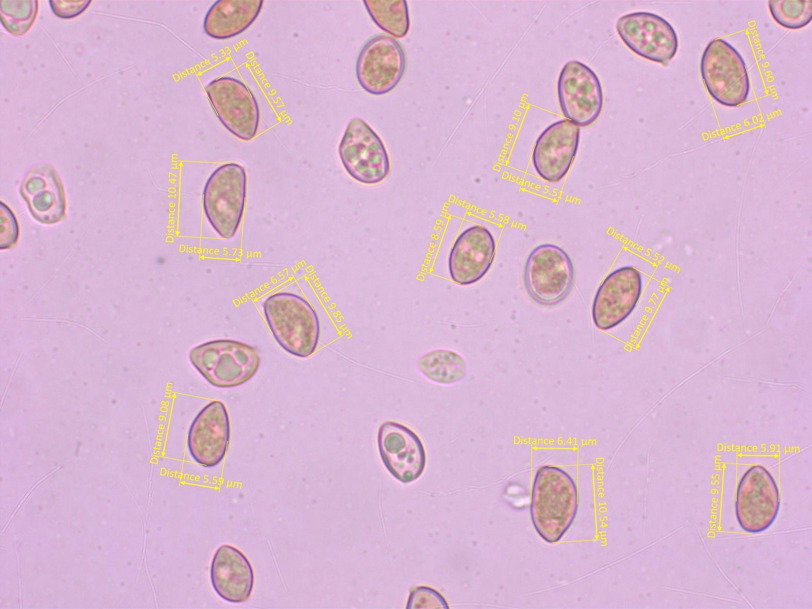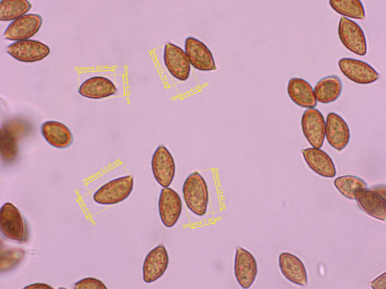 Sporen 9.5-10.6-12.0 x 5.4-6.3-6.8 µm, Q = 1.41-1.69-2.01