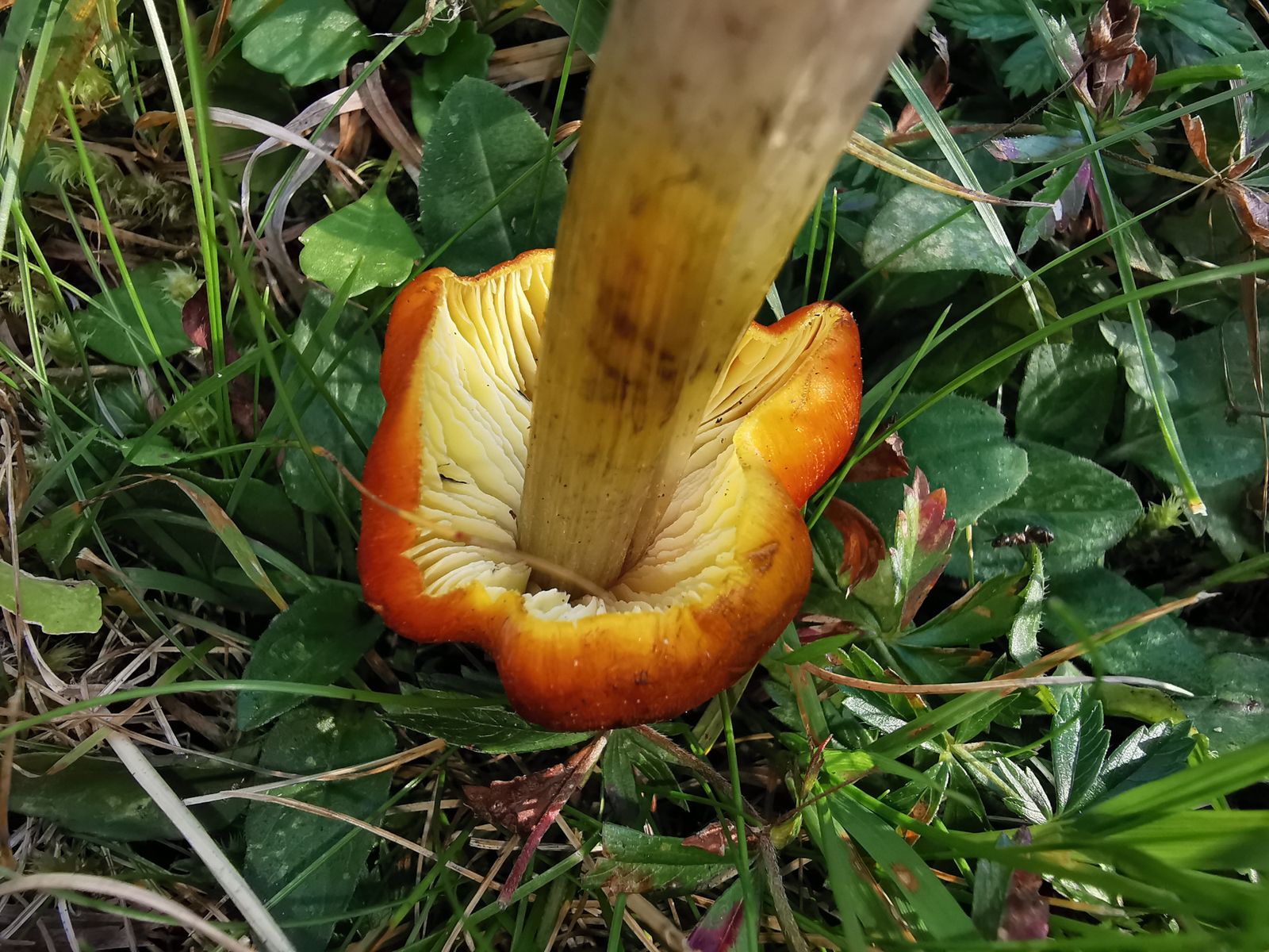Ziemlich am Anfang meiner Tour habe ich mich über den Fund eines Saftlings gefreut. Für mich ist das ein Erstfund und ich finde Saftlinge wirklich wunderschöne Pilze. Ich denke es handelt sich hierbei um den Kegligen Saftling (Hygrocybe conica).