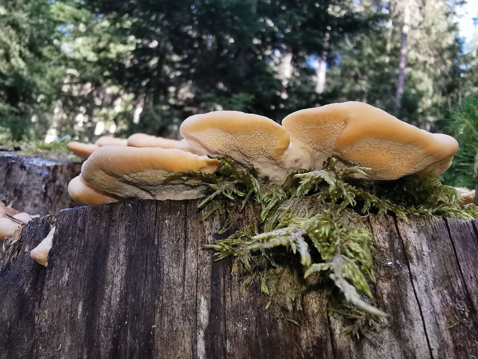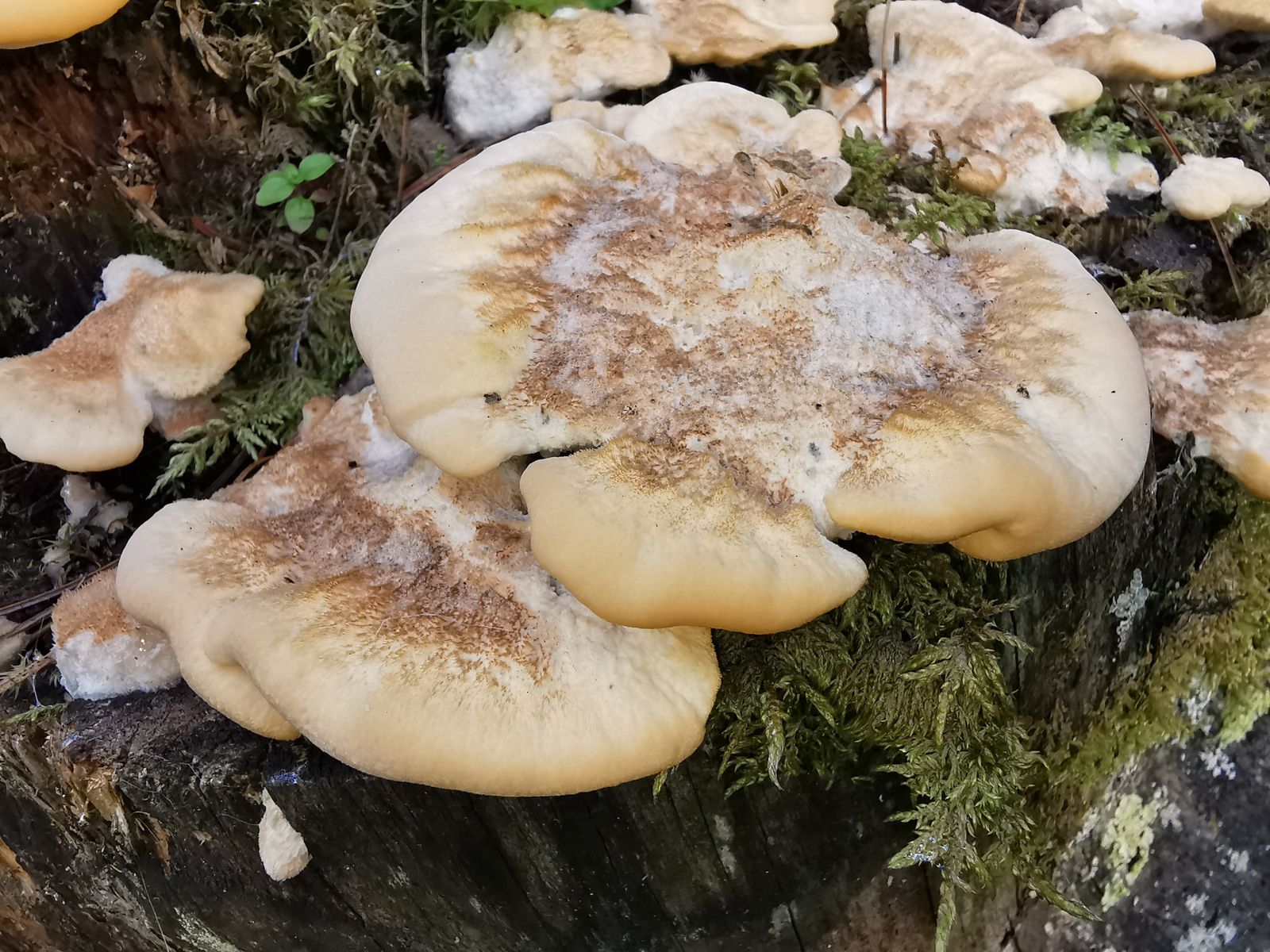 Den nächsten Pilz habe ich an einem Nadelholzstumpf gefunden. Leider habe ich ganz vergessen eine Geruchsprobe zu nehmen. Ich gehe hier von einem Nördlichen Porling (Climacocystis borealis) aus.