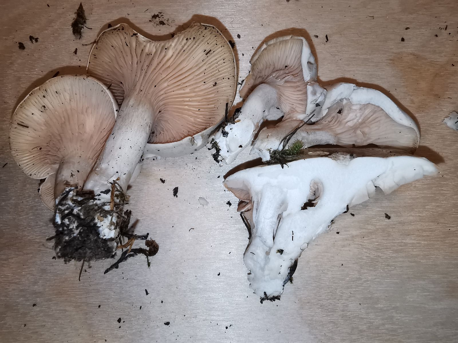 Auch die Mehlräslinge sehen in einigen Aspekten etwas komisch aus für "gängige" Clitopilus prunulus. Nun ist "Mehlräsling" aber auch wieder so ein Aggregat, aus dem sich mehrere Arten trennen ließen - wenn man denn wüsste wie. Oder man könnte mal die ausgefalleneren Arten bei Rhodocybe durchgehen, zumal es auf den Bildern so ein wenig den Anschein hat, als würden die sich so im Übergang Stiel - Lamellen und auch auf der Hutoberfläche leicht grau verfärben? Das wäre für Clitopilus prunulus (agg.) ja auch eher unüblich.