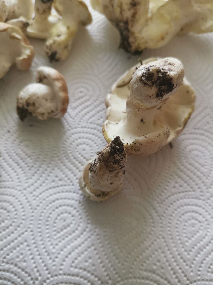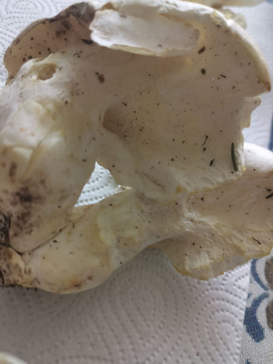 Unterseite glatt und weiß bei jungem Pilz, etwas rauher und gelblich beim älteren Pilz. Braun-Weißer Hut.