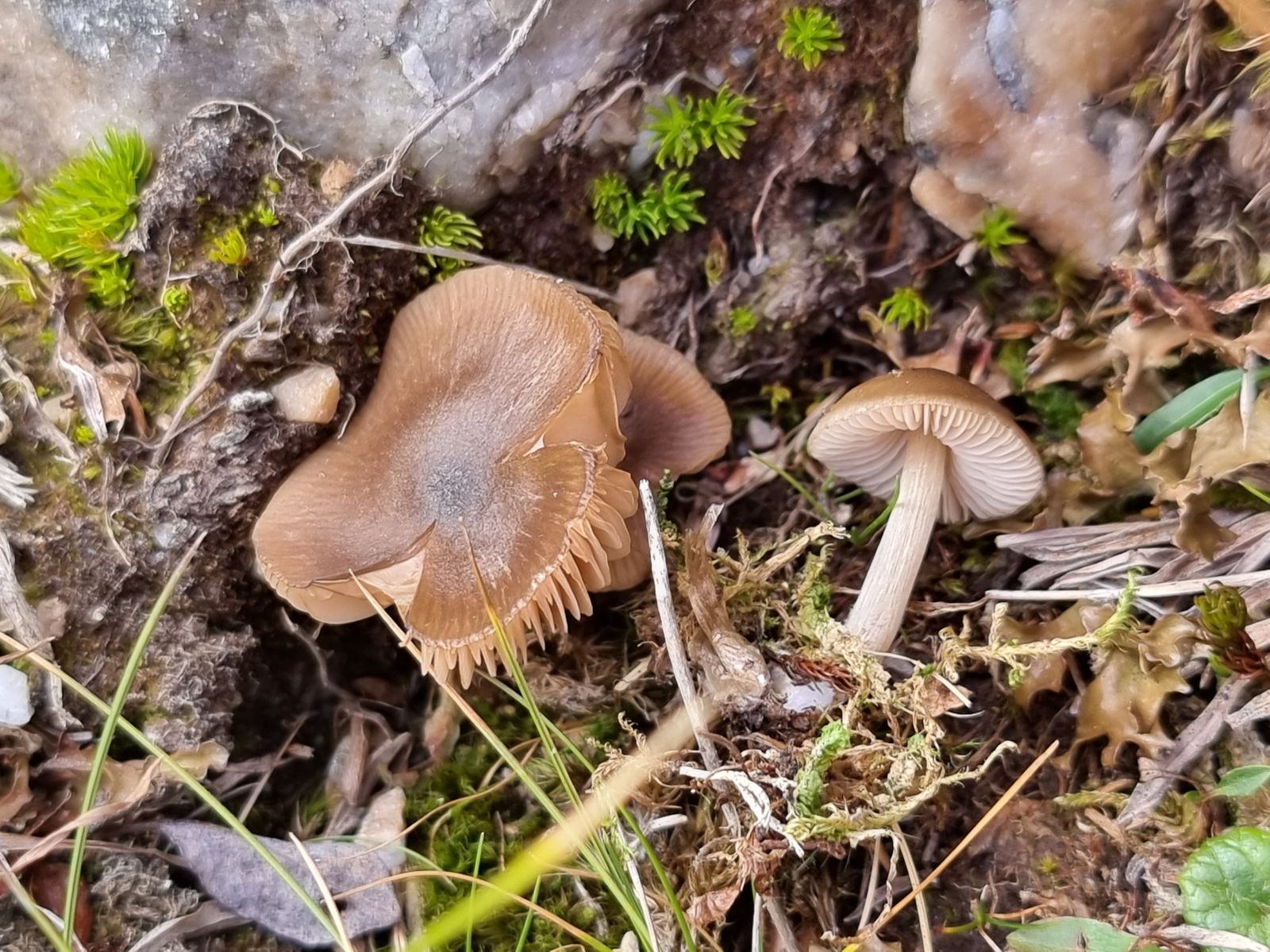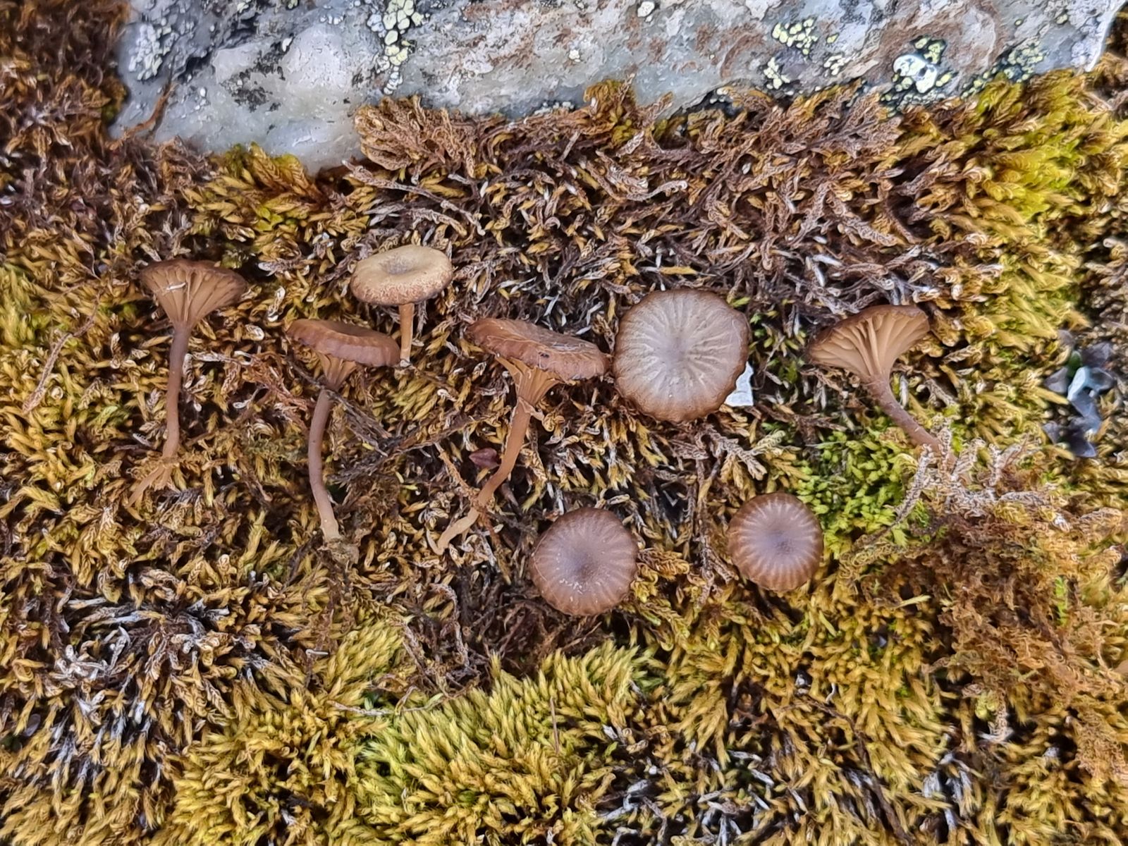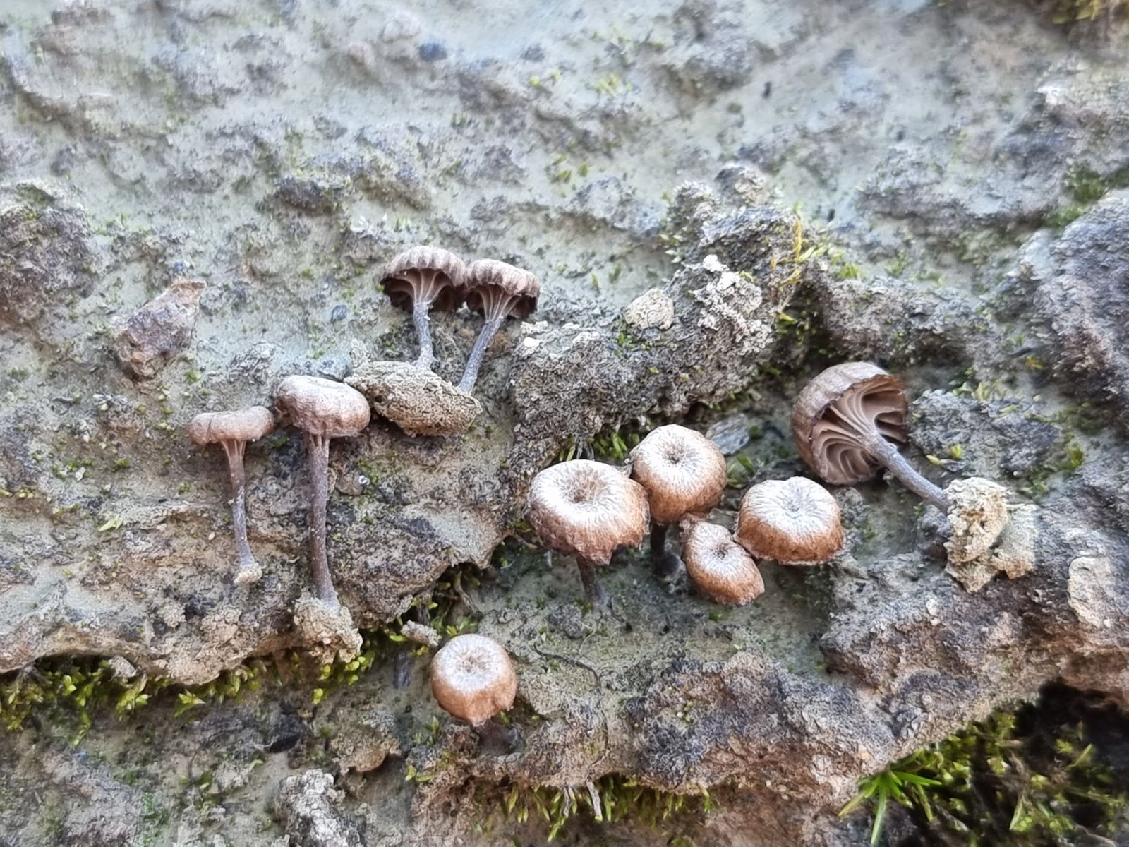 Hier komme ich nach Gröger auf Arrhenia onisca. Mich stört aber diese grobe Riefung der Hüte, nach Ludwig etc. sollte die viel feiner sein.
