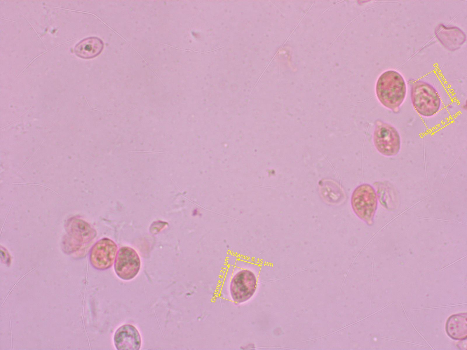 Sporen ziemlich breit und eher klein, weniger über 8 µm. Basidien 4-sporig, keine Zystiden.