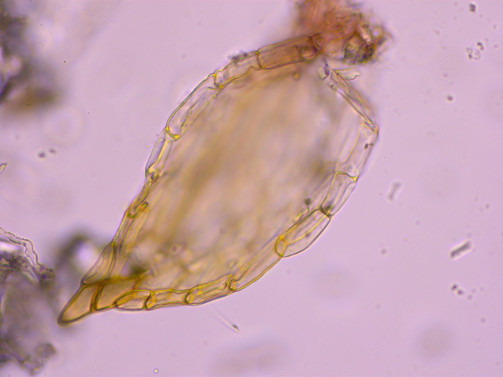 Die Sporen sind - je nachdem wie sie liegen - apikal deutlich verjüngt, so dass die Sporen leicht spindelig-rautenförmig sind.