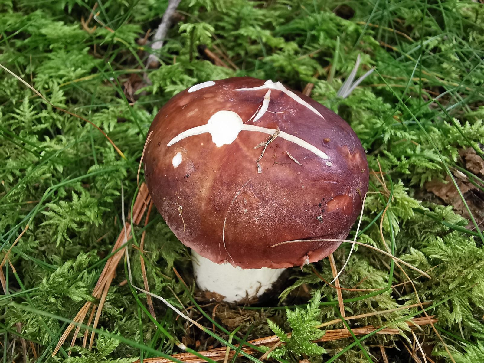 Hut: Bräunlich, mit etwas weinrot. Huthaut lässt sich etwa zur Hälfte gut abziehen.