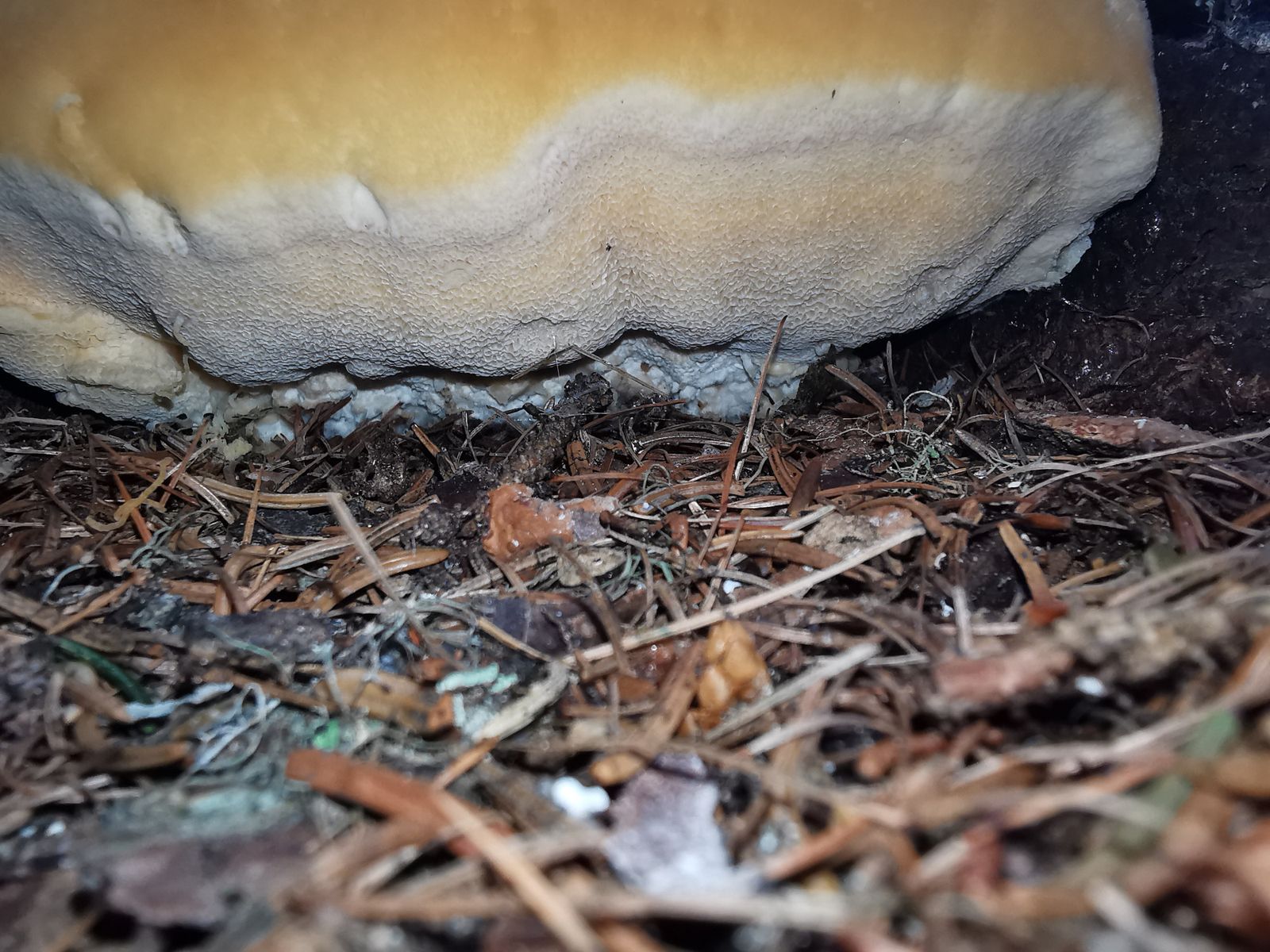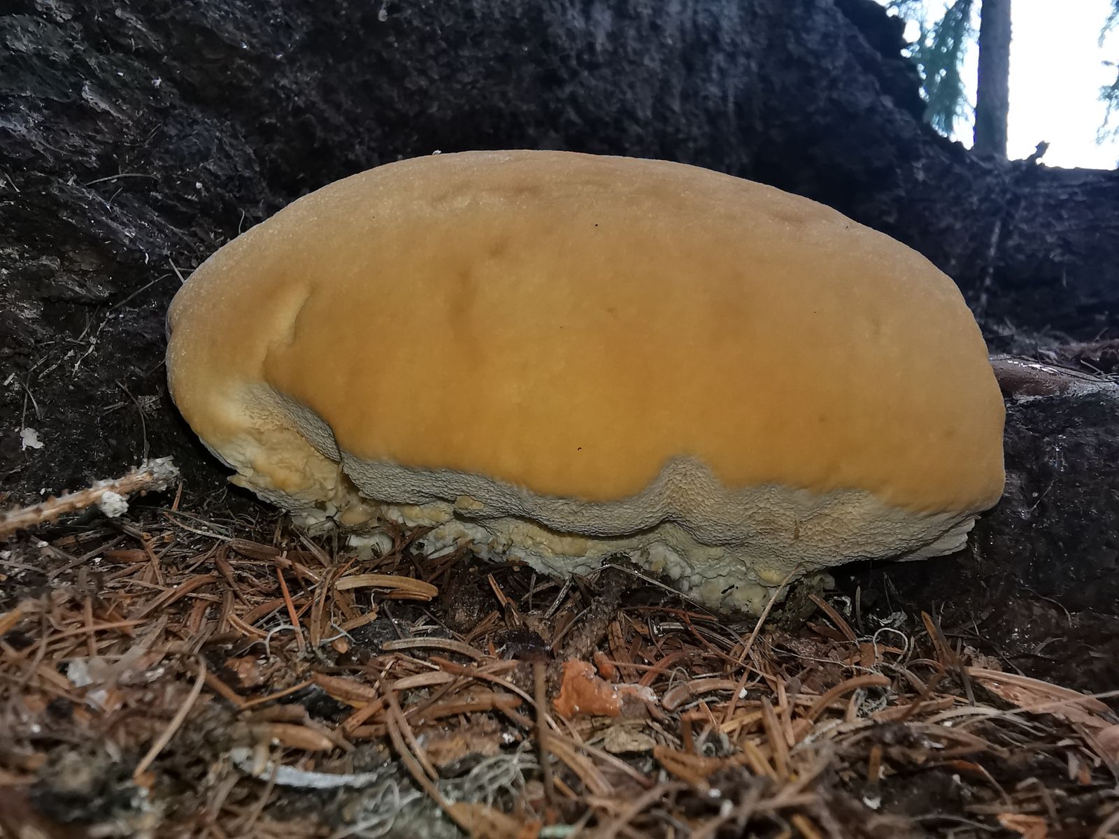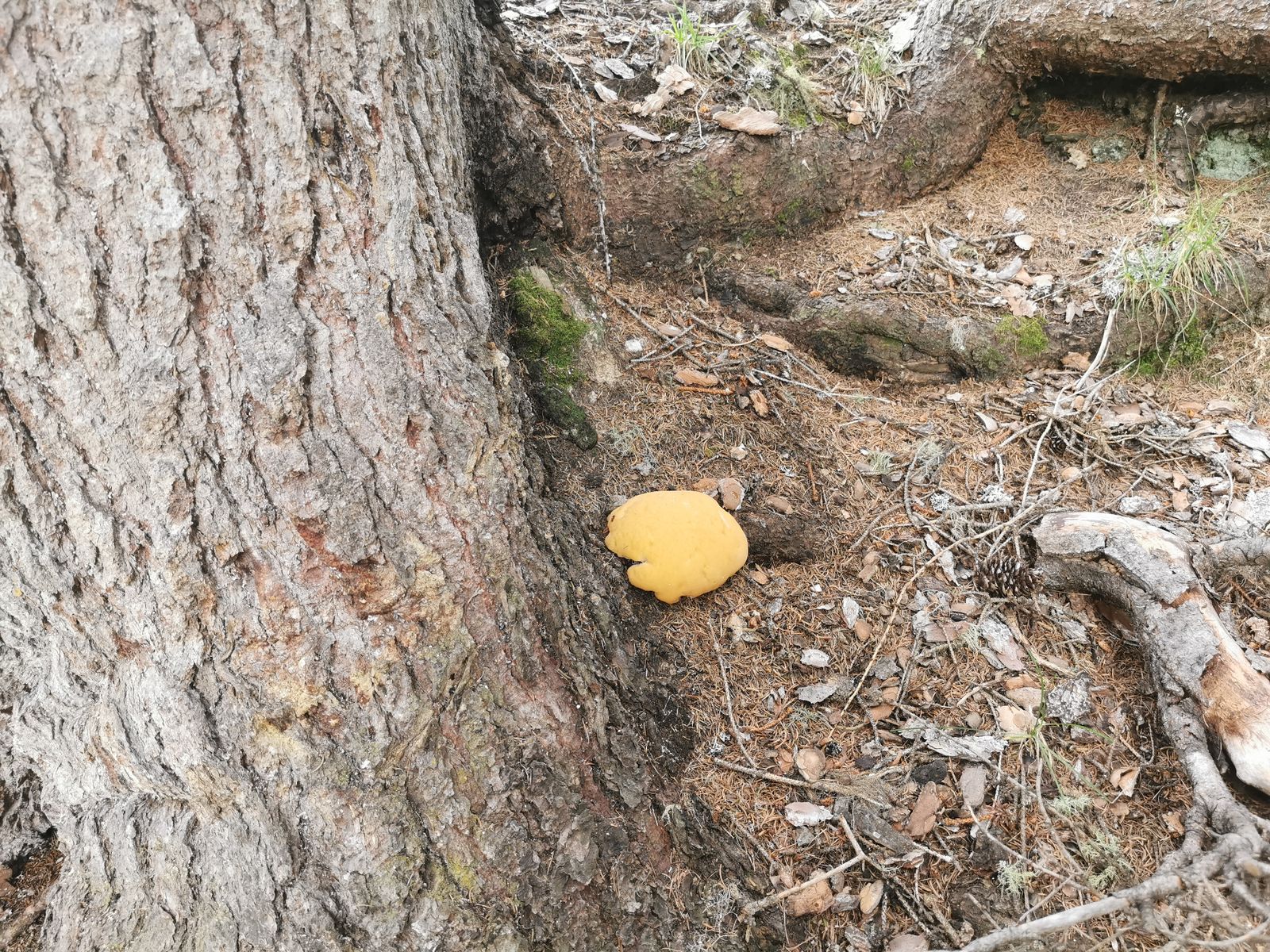 Gestern habe ich einen Fund am Fusse einer Fichte gemacht. An den Wurzeln der Fichte wächst ein vermutlich gelber Porling. Da ich mich mit Baumpilzen überhaupt nicht auskenne, hoffe ich, dass ihr mir weiterhelfen könnt. Der Pilz ist hart und relativ schwer mit dem Messer zu durchschneiden. Das Fleisch ist weiss und den Geruch empfinde ich als etwas harzig.