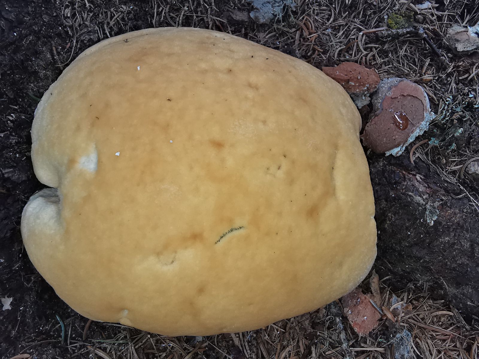 die Farbe käme ja hin, aber sollte ein junger Kiefern-Braunporling nicht saftig-weich sein und eher gelbbraunes Fleisch haben?