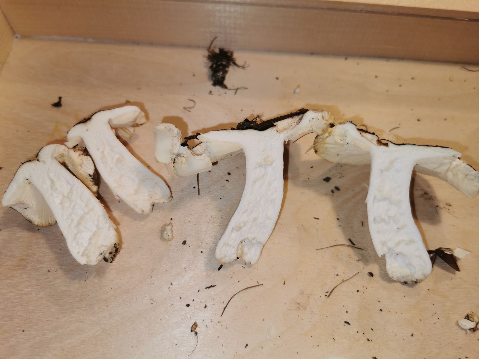 Stiel: Weiss, wattig ausgestopft. Bei Aufritzen der Stielrinde auch nach Stunden nur leichte bräunliche Flecken, kann also kein Graustieltäubling sein.