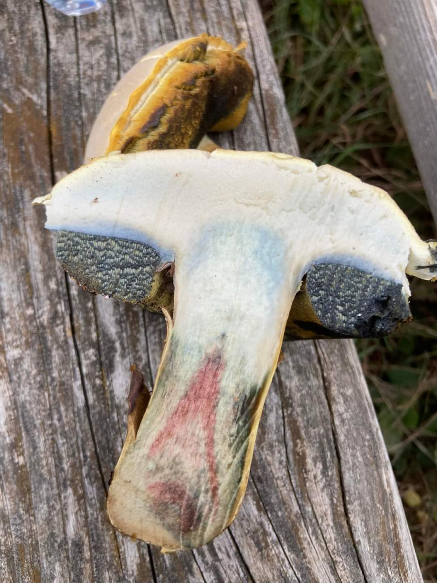 Um die Gattung Caloboletus zu erkennen, kann man auch die Verfärbung der Huthaut auf Druck prüfen. Die bräunt genauso wie in der Gattung Rubroboletus (sind beide sehr nah verwandt), also Satanspilz und Co.