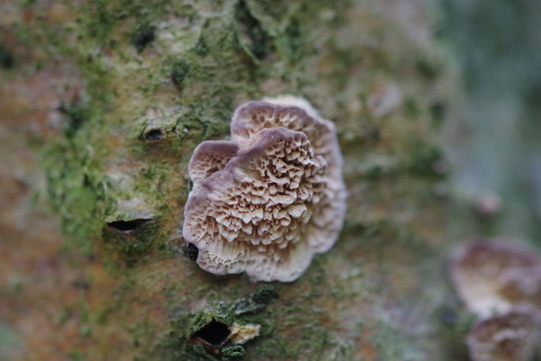 3) Antrodia oder so (am gleichen Haselast wo Dichomitis campestris haust(e) und Resupinatis trichotis), wie cih finde sehr fotogen