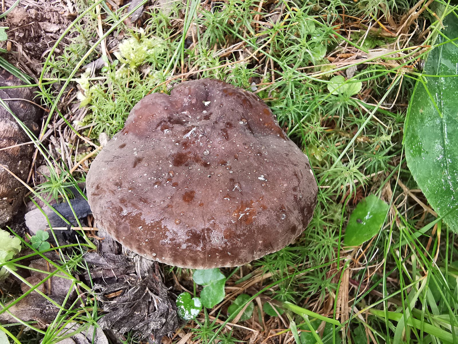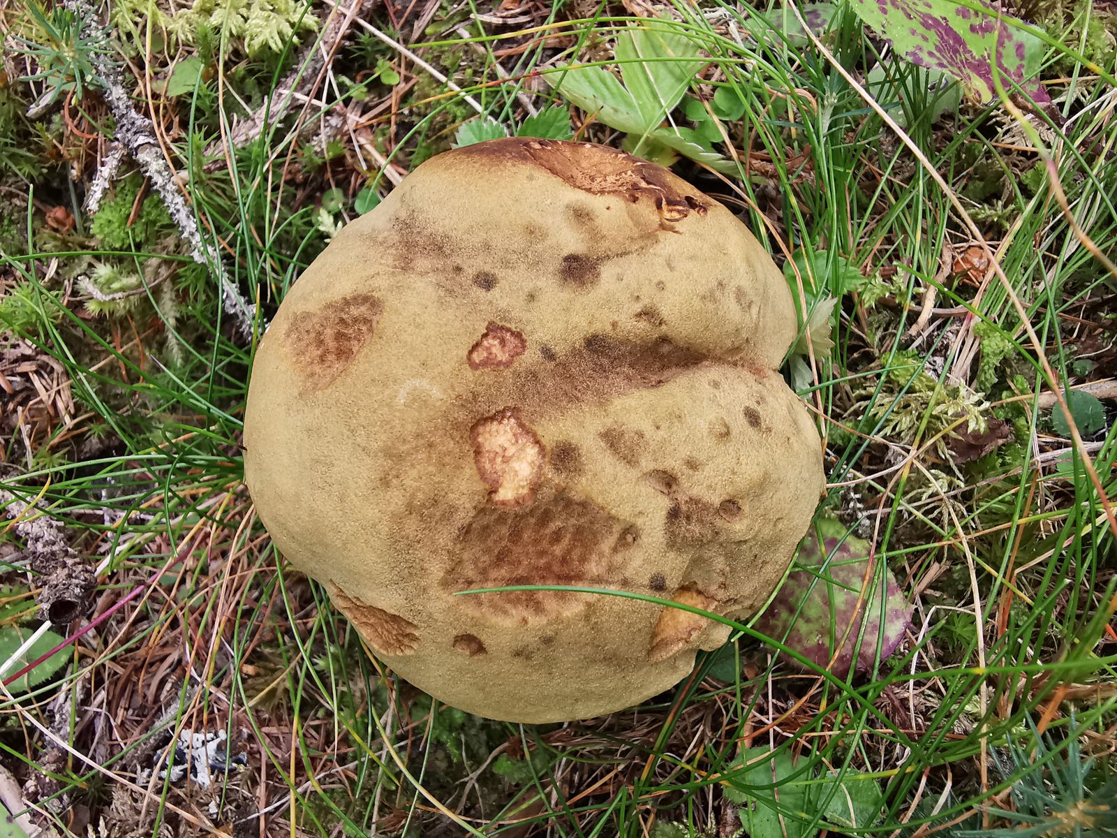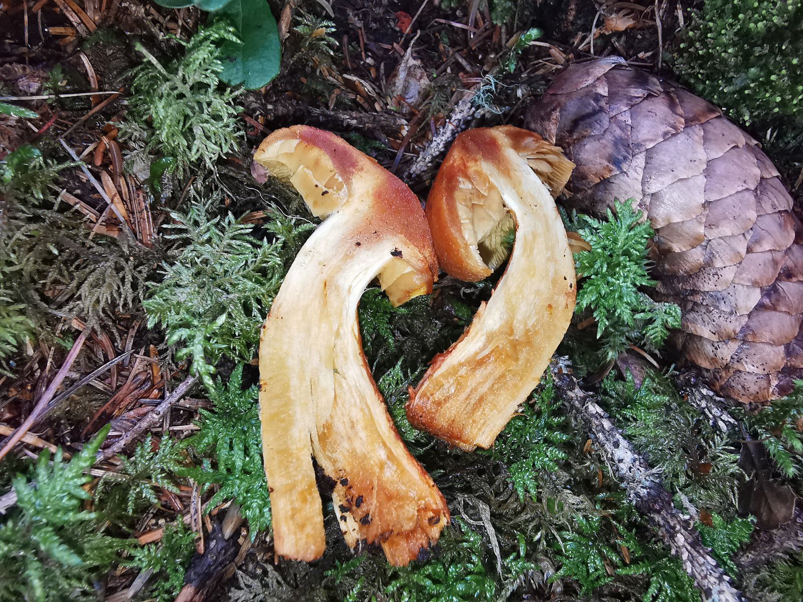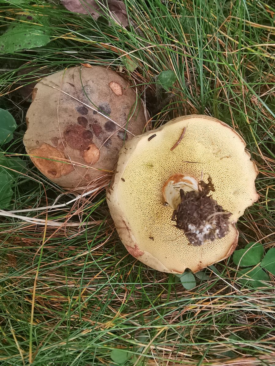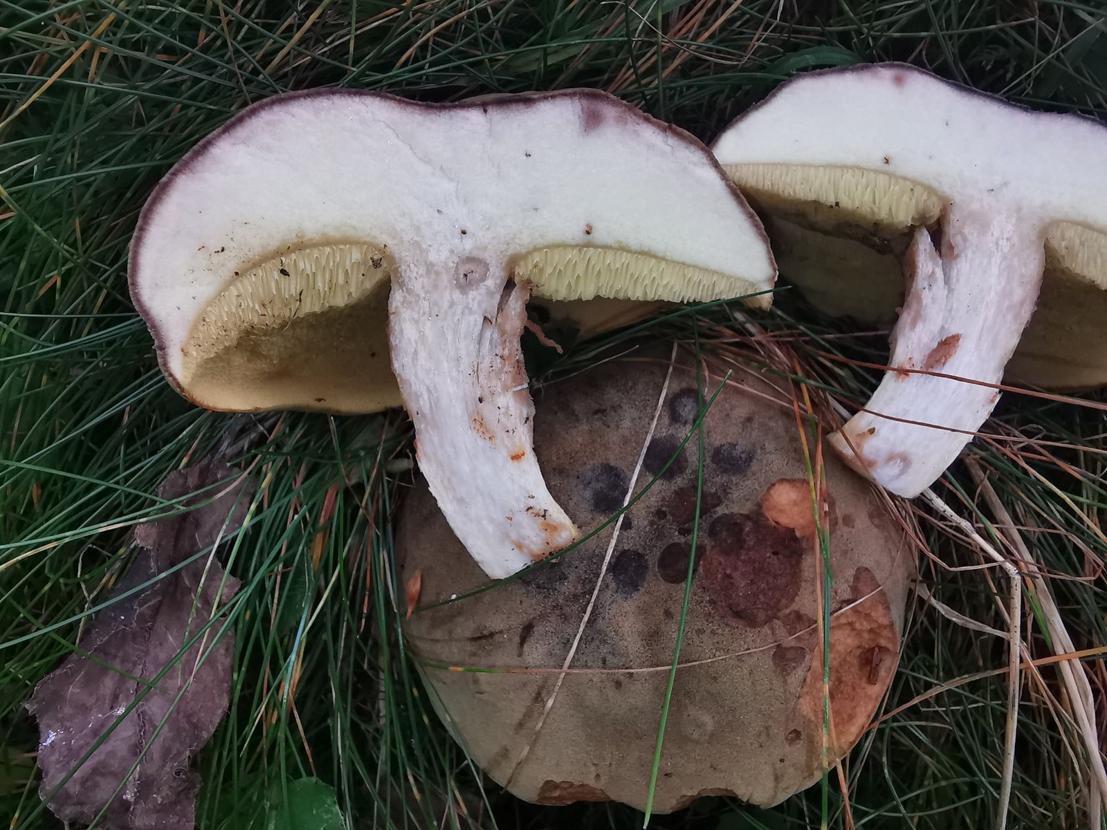 6. Brauner Filzröhrling - Xerocomus ferrugineus. Hier bin ich mir nicht ganz sicher, es könnte vielleicht auch eine Ziegenlippe - Xerocomus subtomentosus sein. Ich empfinde hier den Stiel als etwas undeutlich und tue mich oft noch etwas schwer damit, einzuschätzen, ob das jetzt ein feines Netz ist, oder nicht. Gefunden wurde der Pilz bei einer Fichte. Gerne höre ich eure Meinung dazu.