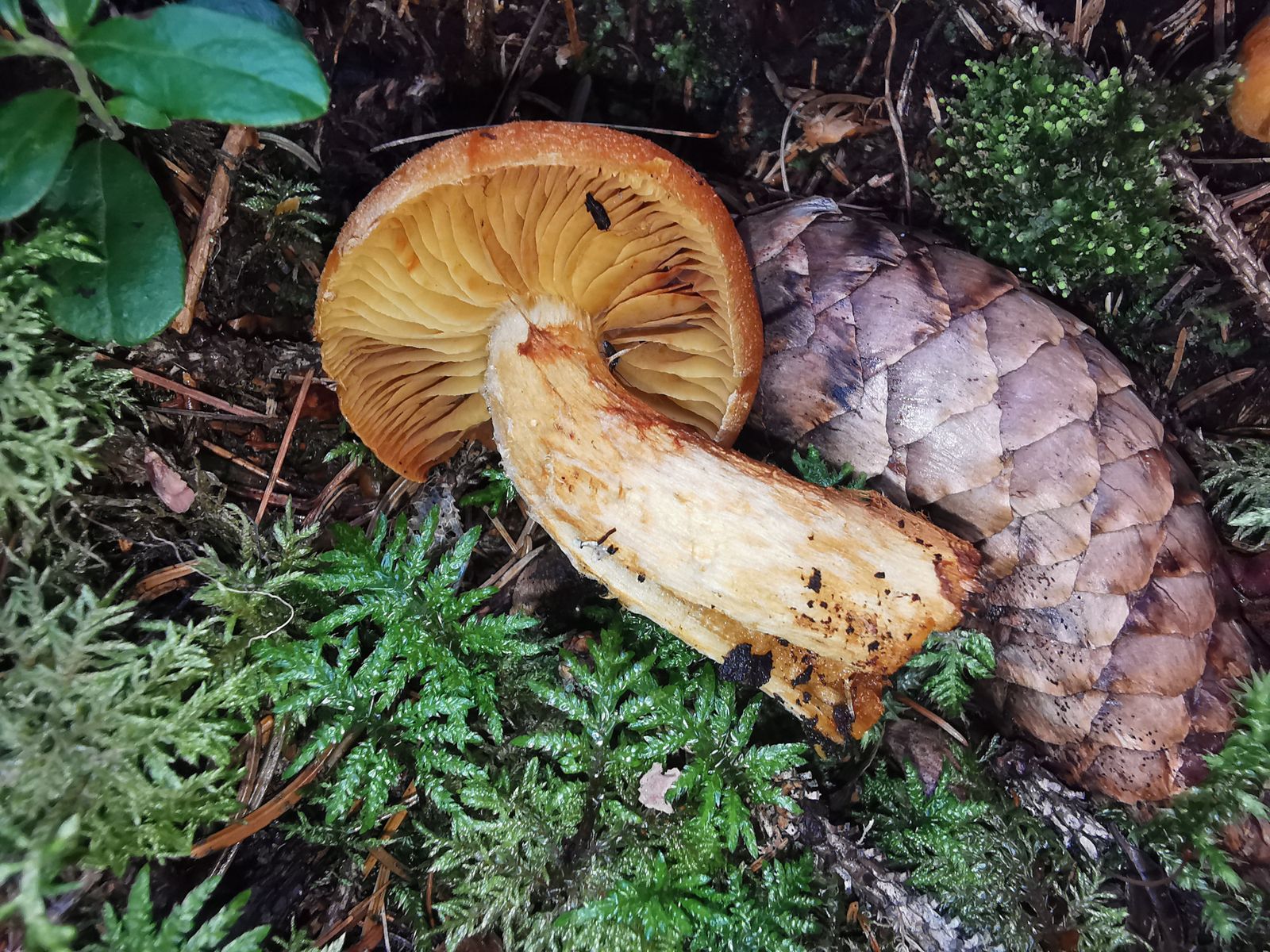 9. Zitronengelber Raukopf - Cortinarius limonius. Bei Fichten im Moos stand eine grosse Gruppe mit FK in allen Grössen. Durch die hygrophanen Hüte dachte ich an Cortinarius limonius.