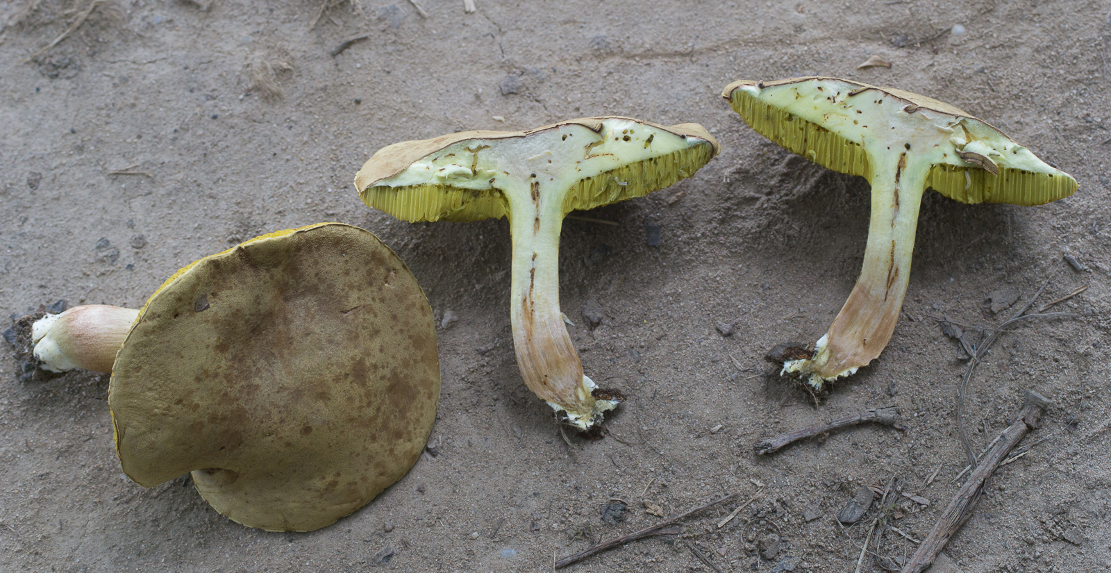 Bitte, niemals, never ever, die Stielbasis abschneiden. Du schmeißt unötig Bestimmungsmerkmale weg, die es dann schwerer machen. Bei der Ziegenlippe i.w.S. ist die Farbe des Basalmyzels wichtig, bei anderen Arten auch Farbdetails des Fleisches der Stielbasis.