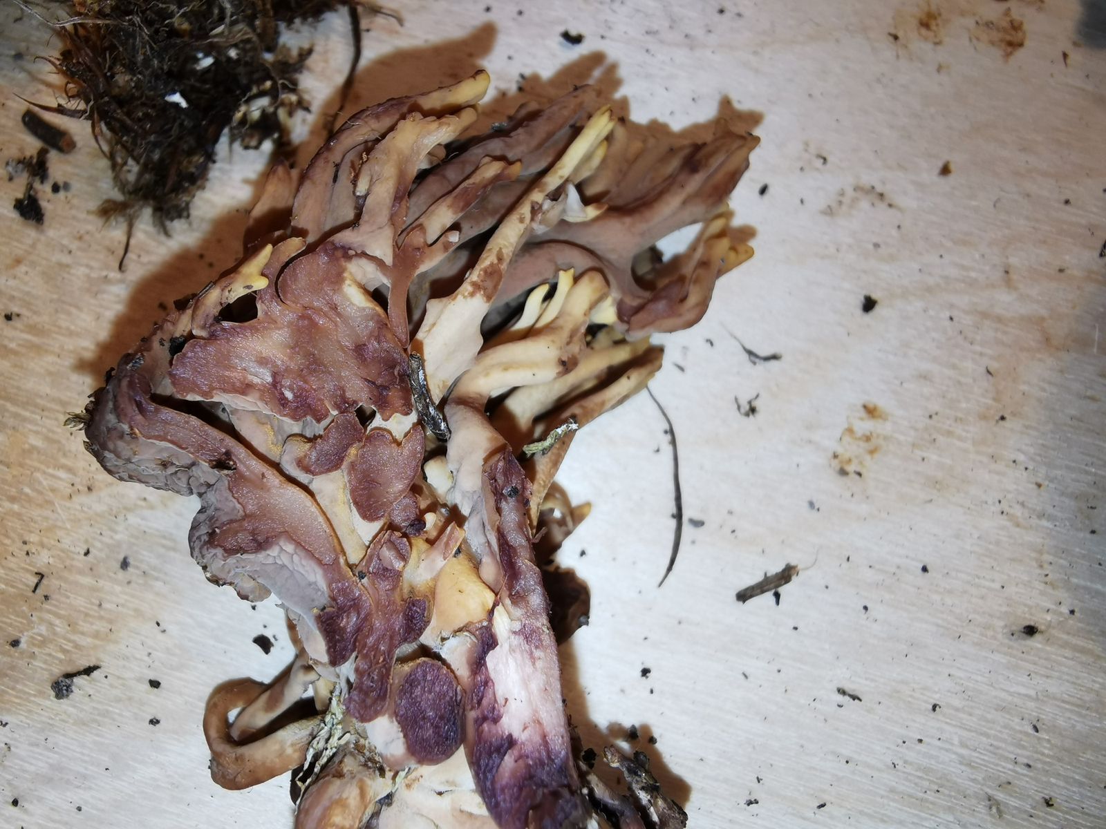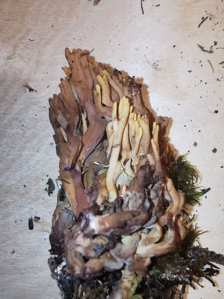 Was ich zuerst nicht nachvollziehen konnte, war die weinrote Verfärbung bei Verletzung, aber als ich ein paar Minuten später nochmal schaute, hat sich die Stelle wirklich ins weinrötliche verfärbt (siehe letztes Bild). Gibt es denn noch eine andere Ramaria, die so eine Verfärbung zeigt und in meinem Habitat vorkommt? Ansonsten kann es ja eigentlich nur diese sein, oder? Hier noch die neuen Fotos:
