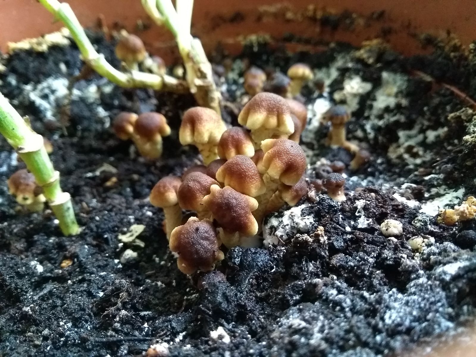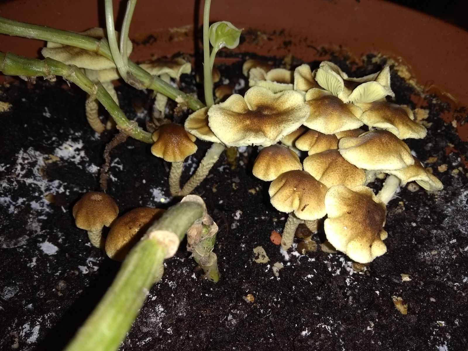 Ja moin. Hier nur mal ein kleines Update. Ich habe die Efeutute schon etwa seit 4 Jahren, und habe irgendwann mal die alte Erde weggeschmissen, die Wurzeln gewaschen und mir irgendwo Erde ausgebuddelt, von der ich dachte, sie würde ganz nährstoffreich aussehen. Und seit ungefähr einem Monat habe ich einen Gast. Und wollte euch ein schönes Foto von den jungen Fruchtkörpern liefern.
