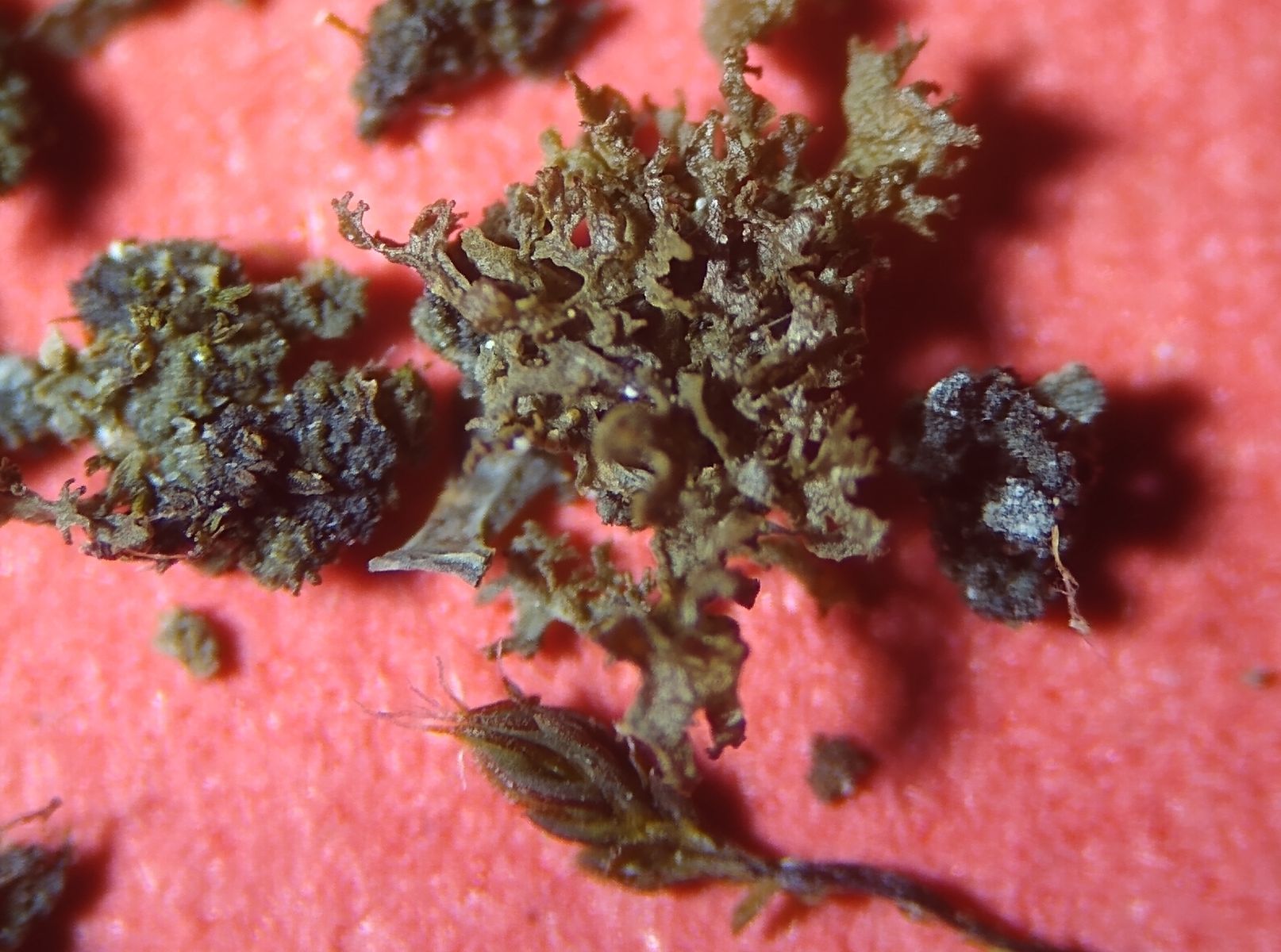 Mein Verdacht ist deshalb, dass sich hier ein Hornmoos auf der Oberfläche der Cyanoflechte niedergelassen hat, dort den Phycobionten der Flechte in sich aufnehmen konnte und auf der Flechte weiterwächst.
