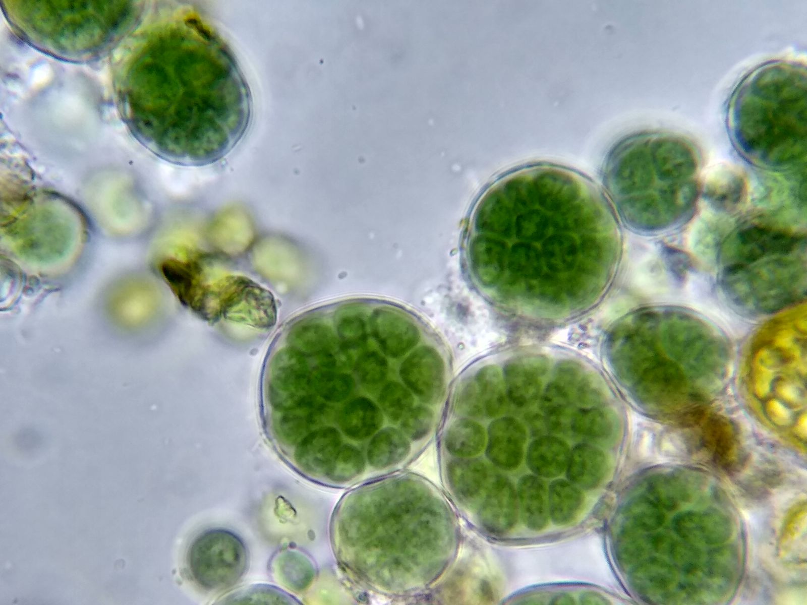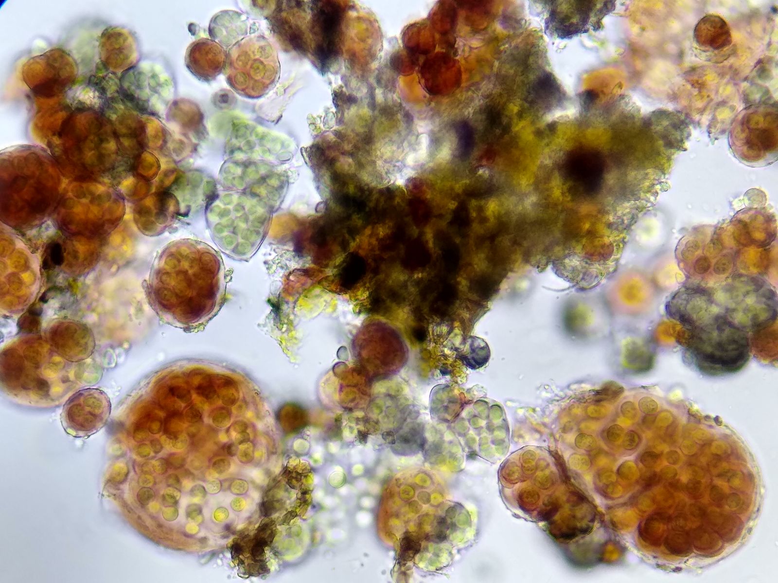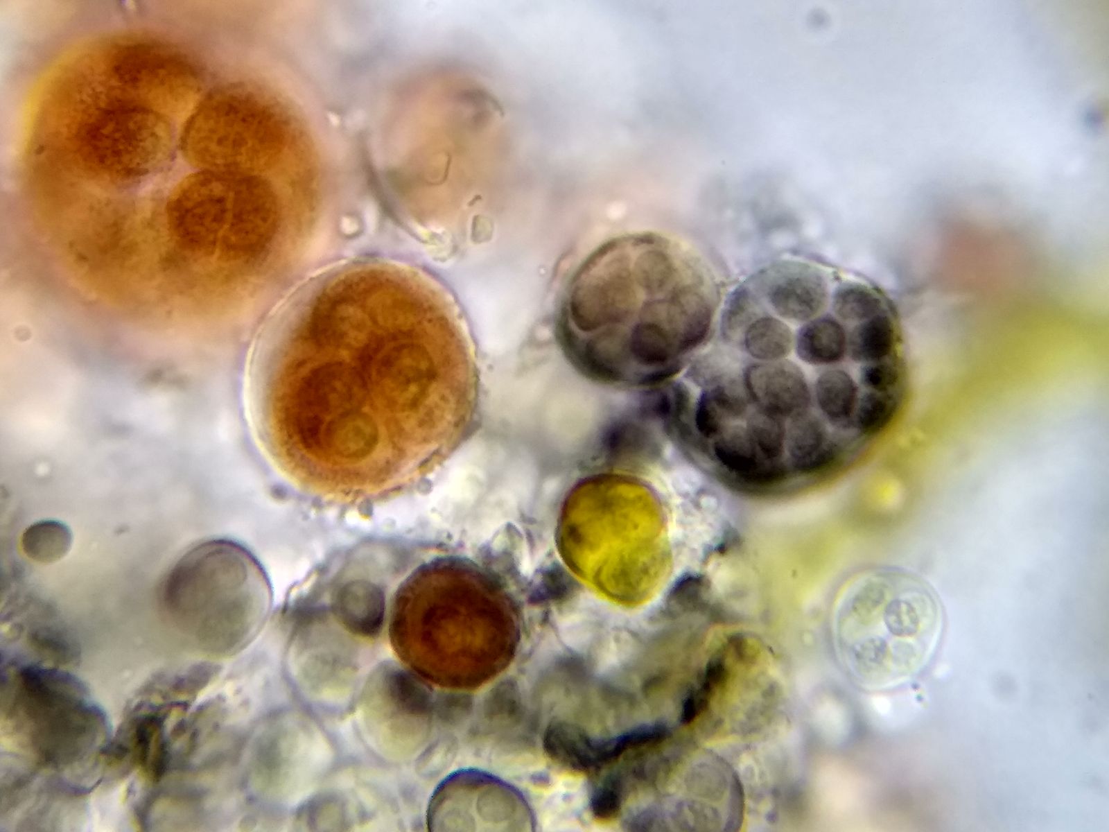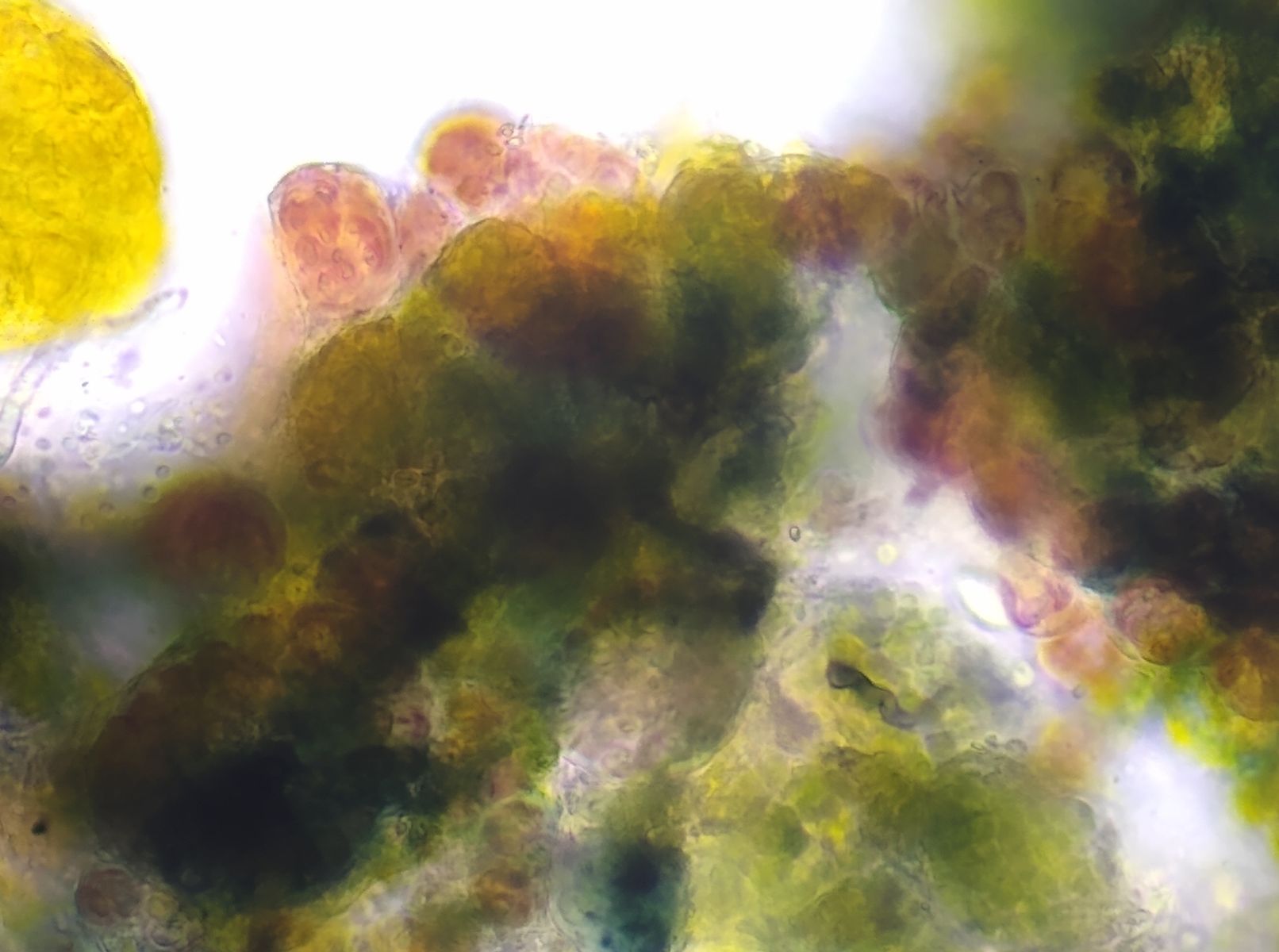 Hier könnte es sich um andere Cyanobakterien handeln (wie Gloeocapsa) oder vielleicht wiederum um Nostoc-Zellen in Gallertkugeln - können die auch in bunt?