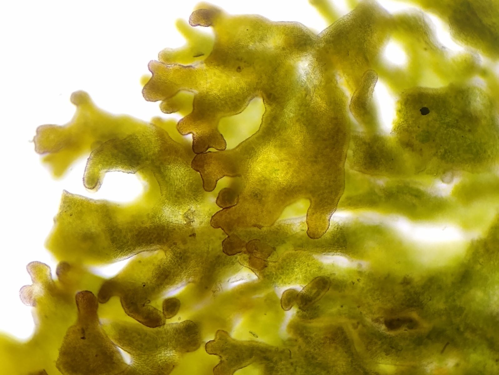 Unter dem Mikroskop erscheint die Oberfläche des Thallus von eckigen Pflanzenzellen gebildet zu sein.