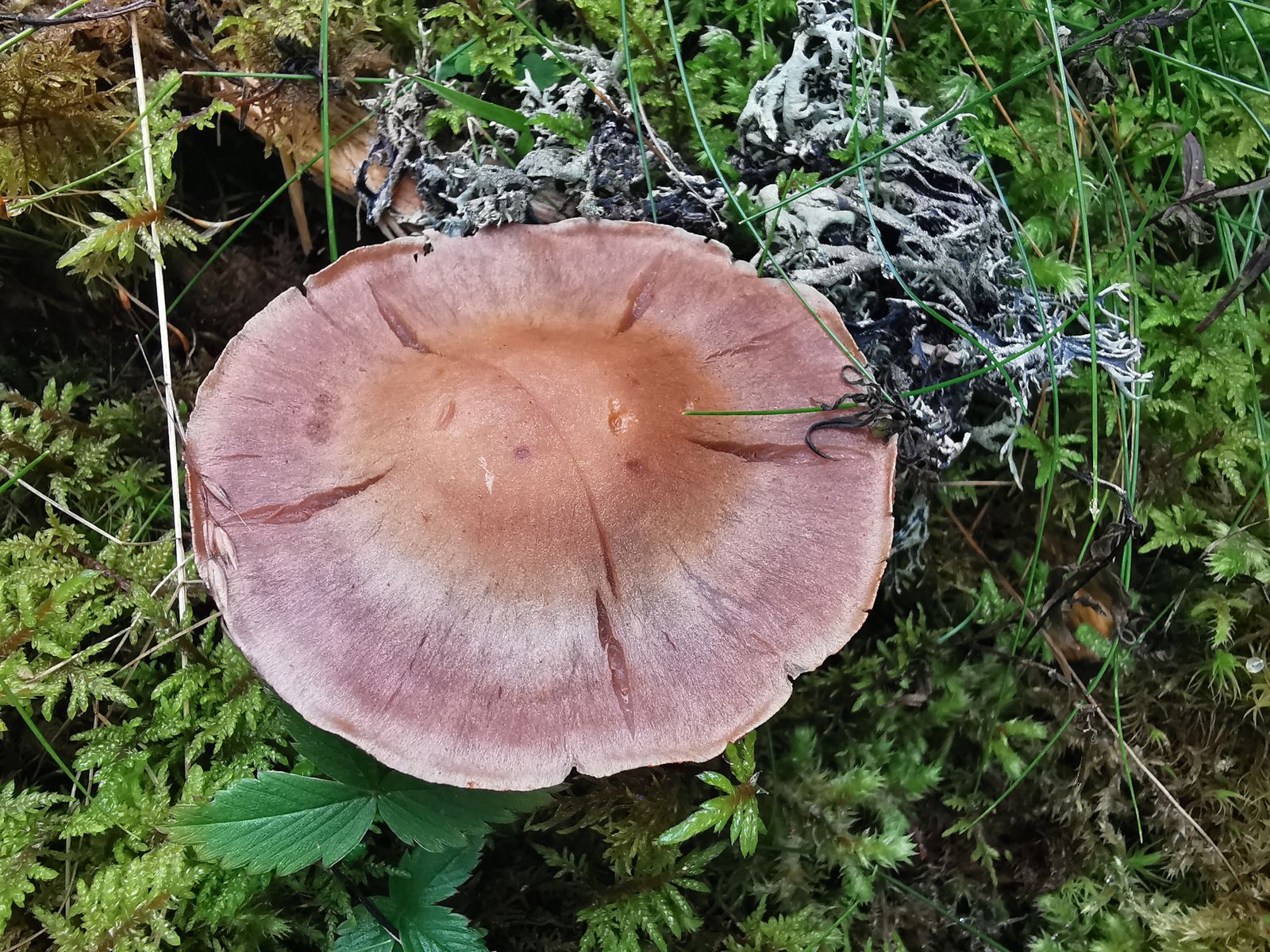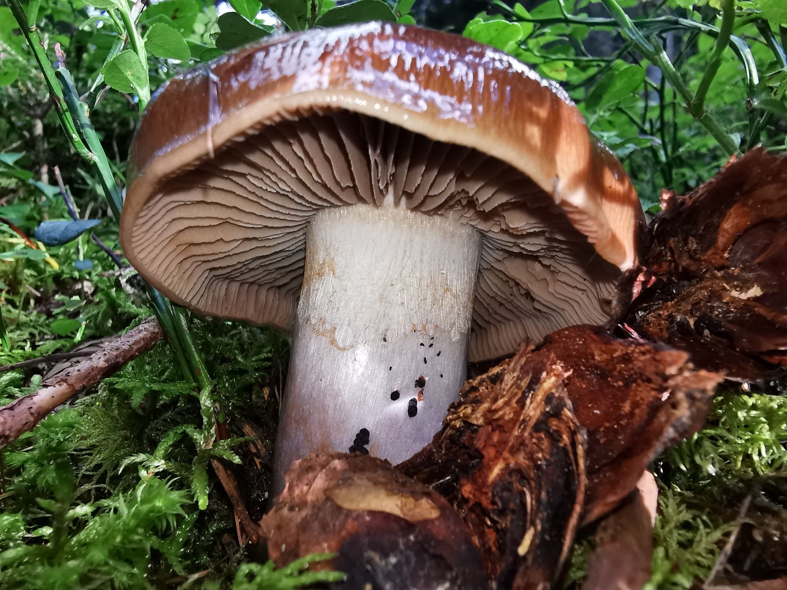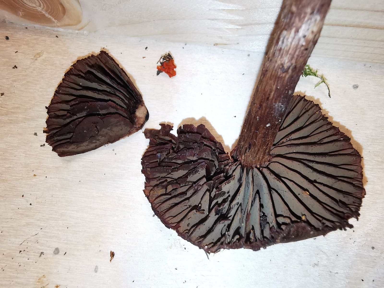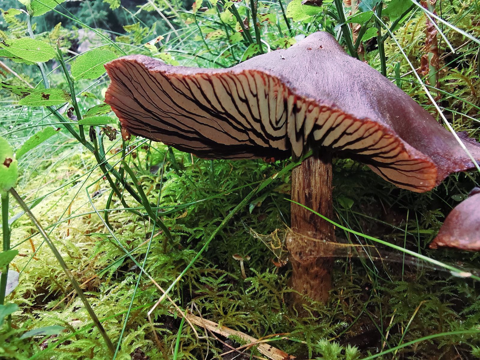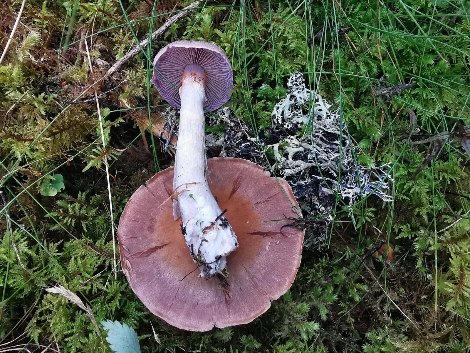 Anfangen möchte ich mit etwas vermeintlich einfachem. Ich denke es handelt sich hierbei um einen Blutroten Hautkopf - Cortinarius sanguineus. Leichter Geruch nach Rettich. Dieses Mal habe ich auch mal den Test mit Alkohol gemacht, der ja nur bei Hautköpfen, nicht aber bei Rauköpfen funktioniert. Bäume: Fichte