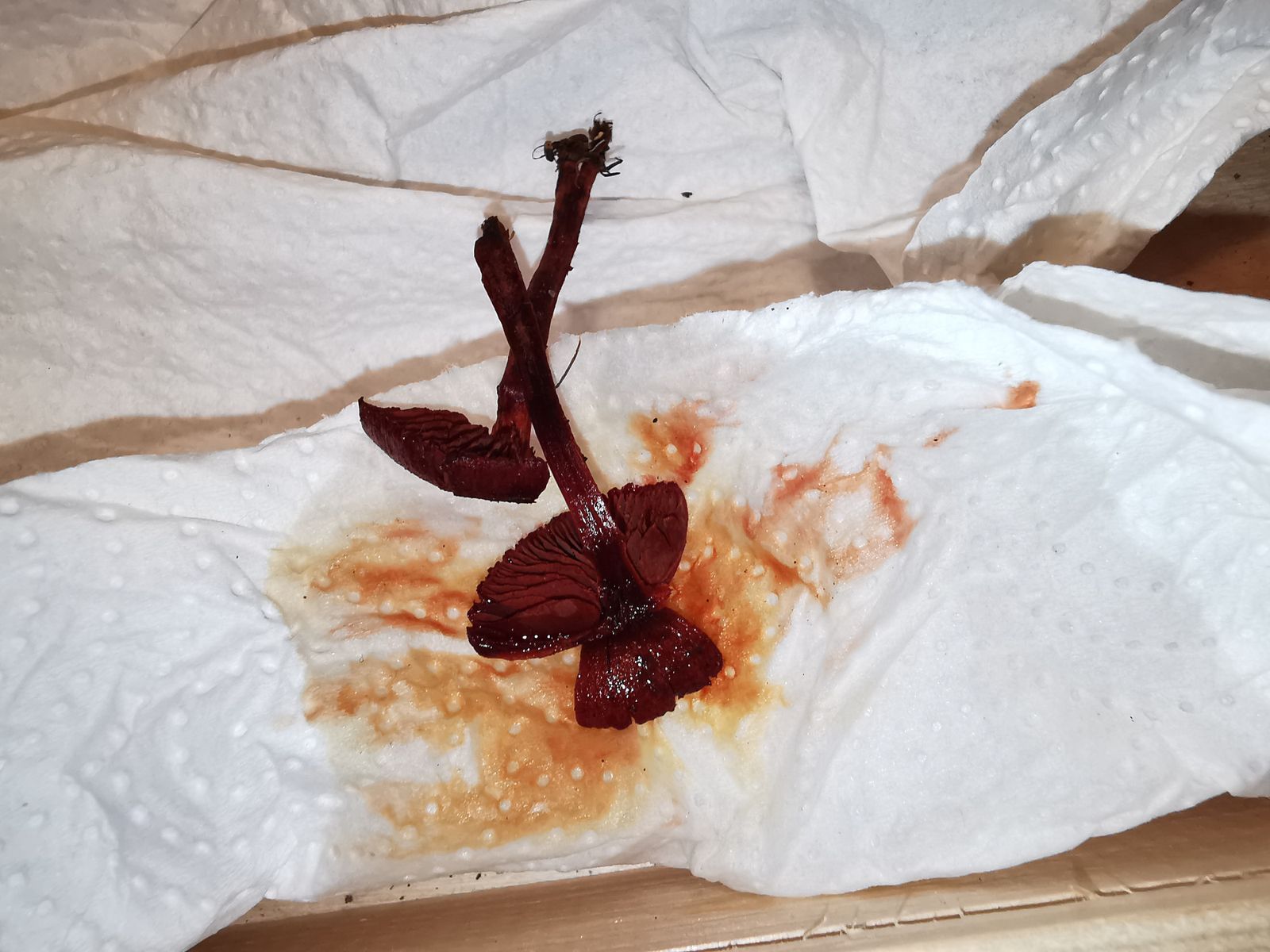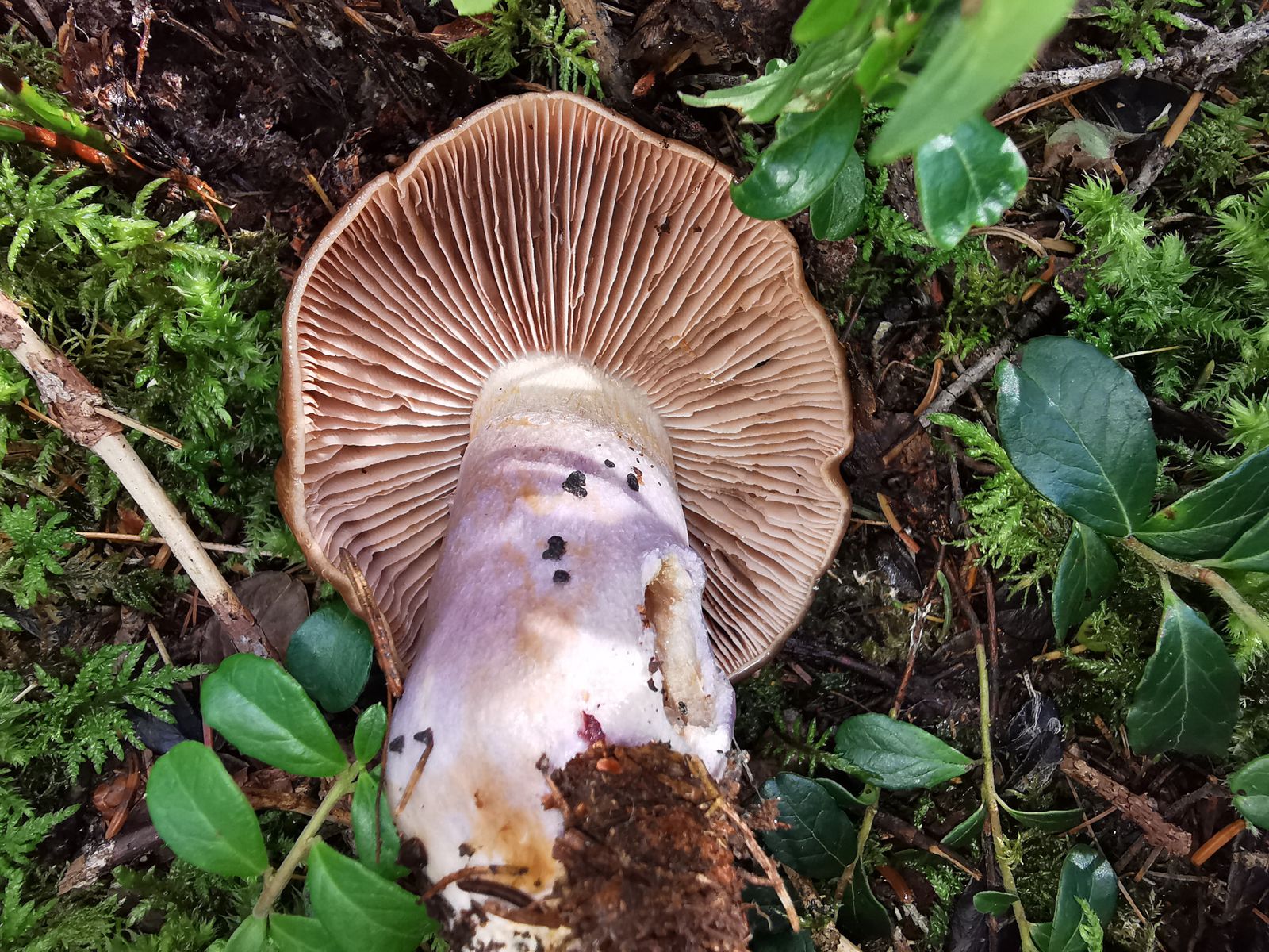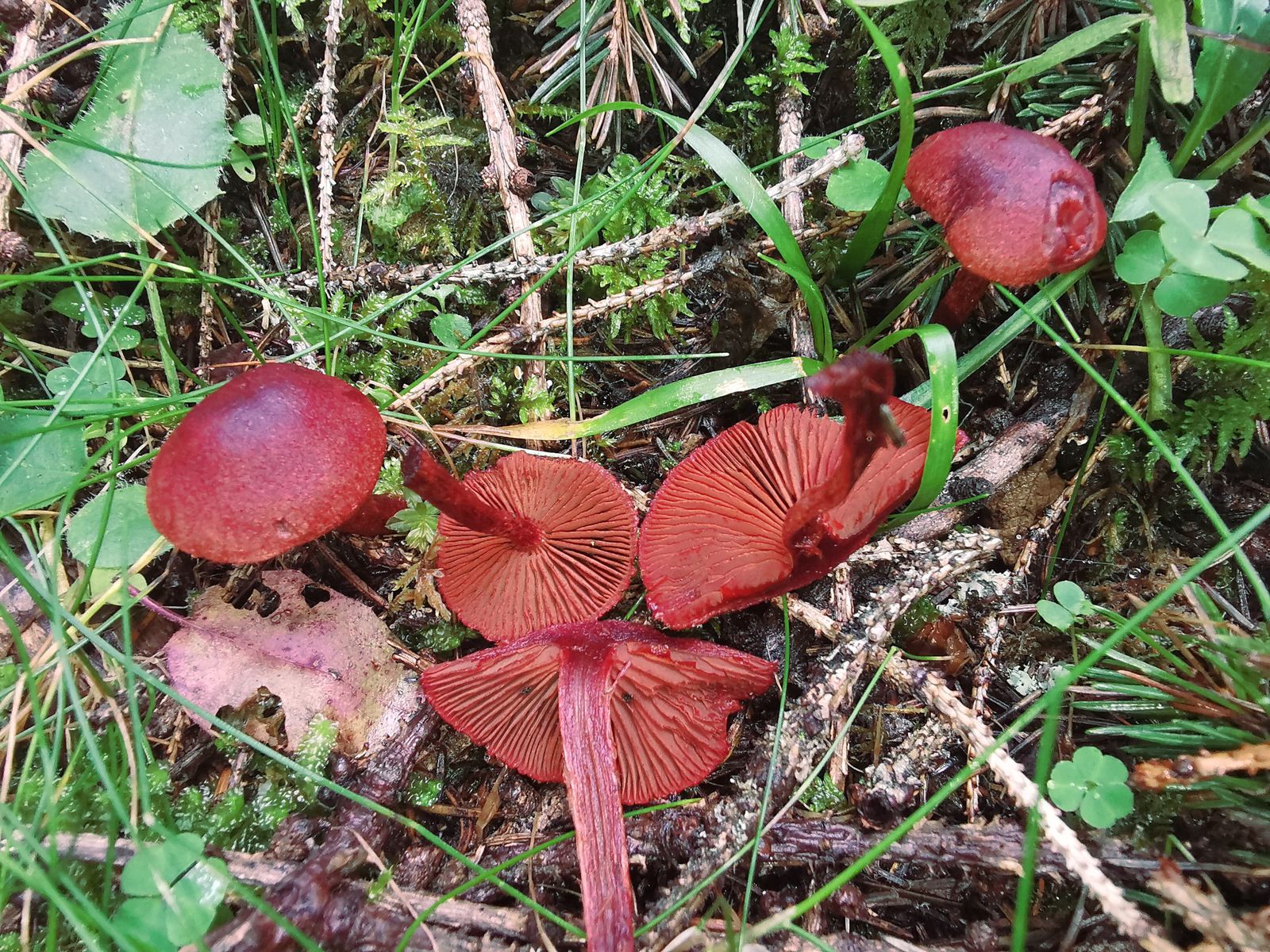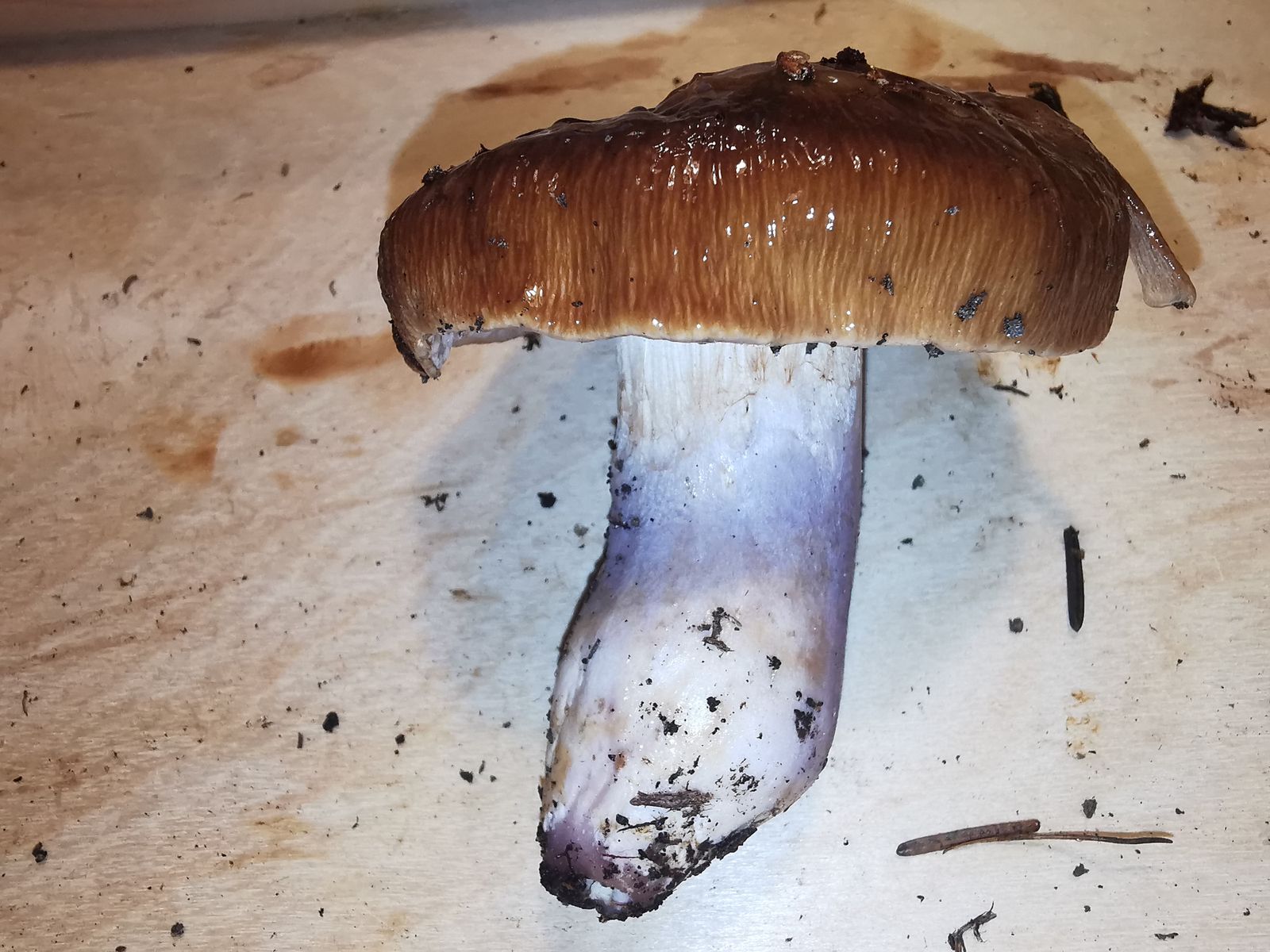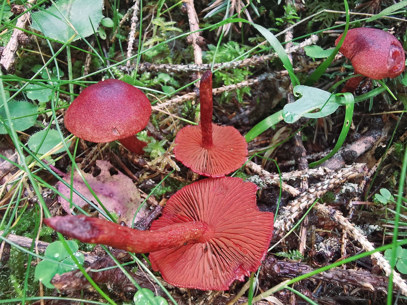 Anfangen möchte ich mit etwas vermeintlich einfachem. Ich denke es handelt sich hierbei um einen Blutroten Hautkopf - Cortinarius sanguineus. Leichter Geruch nach Rettich. Dieses Mal habe ich auch mal den Test mit Alkohol gemacht, der ja nur bei Hautköpfen, nicht aber bei Rauköpfen funktioniert. Bäume: Fichte