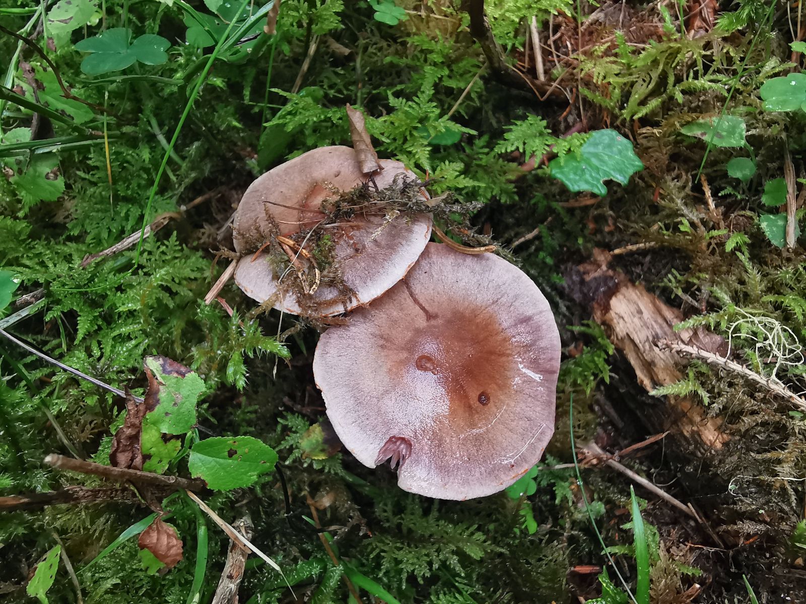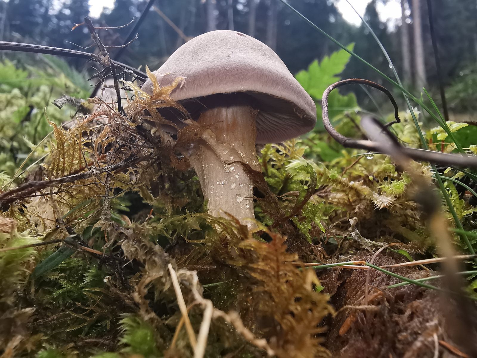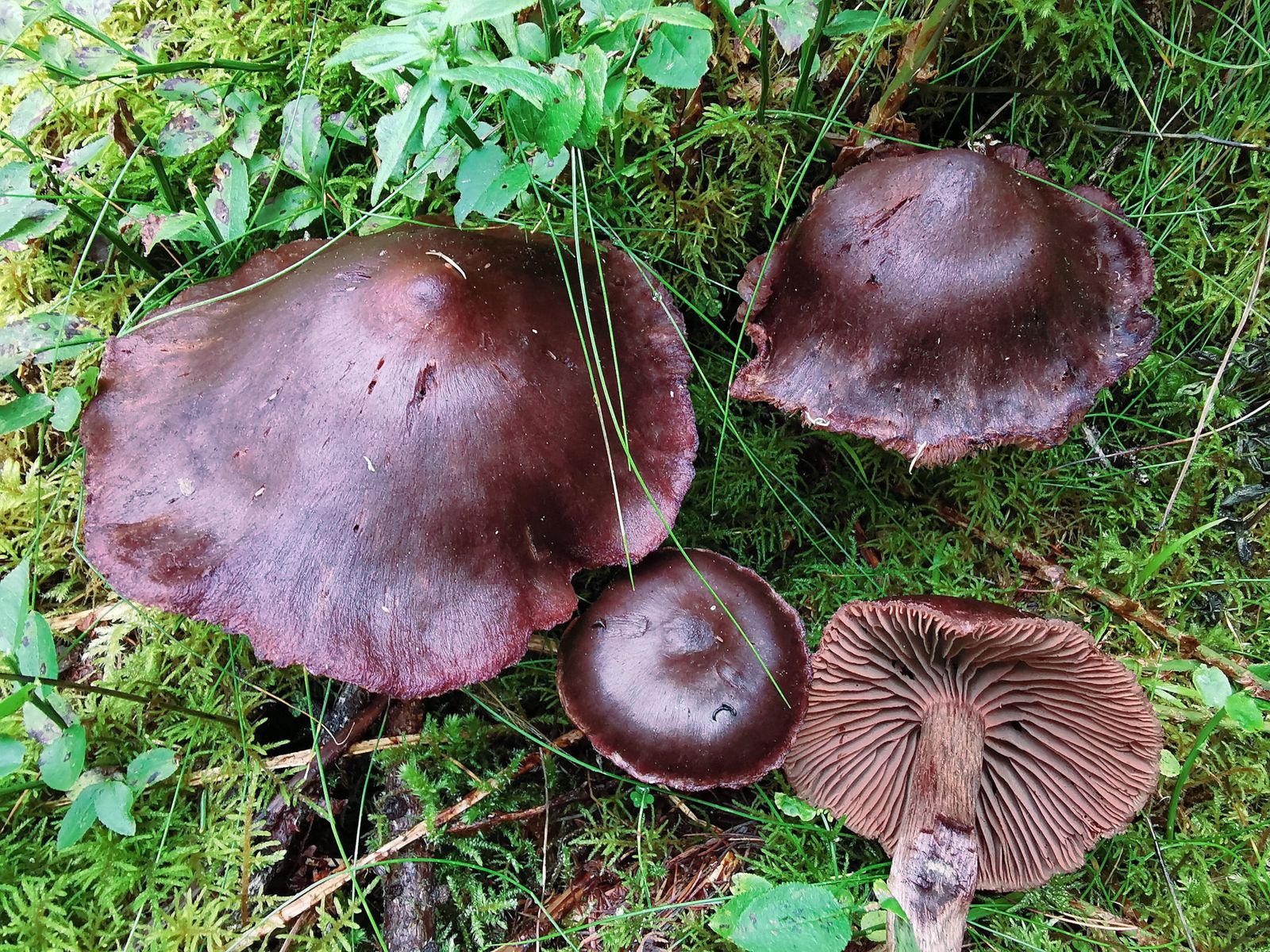 Als nächstes habe ich eine ganze Gruppe braunvioletter bis graubrauner Schleierlinge gesehen. Die Hüte waren oft in der Mitte eher bräunlich und nach aussen hin eher violettlich. Den Geruch empfand ich als ziemlich neutral. Die Lamellen waren bei den jüngeren Exemplaren hellviolett und bei den älteren Exemplaren mehr bräunlich. Meine Vermutung ist hier der Braunviolette Dickfuss - Cortinarius anomalus. Bäume: Fichte