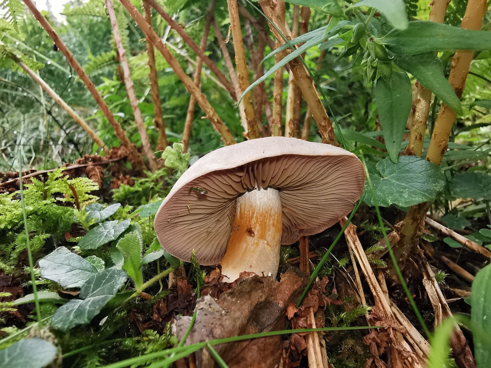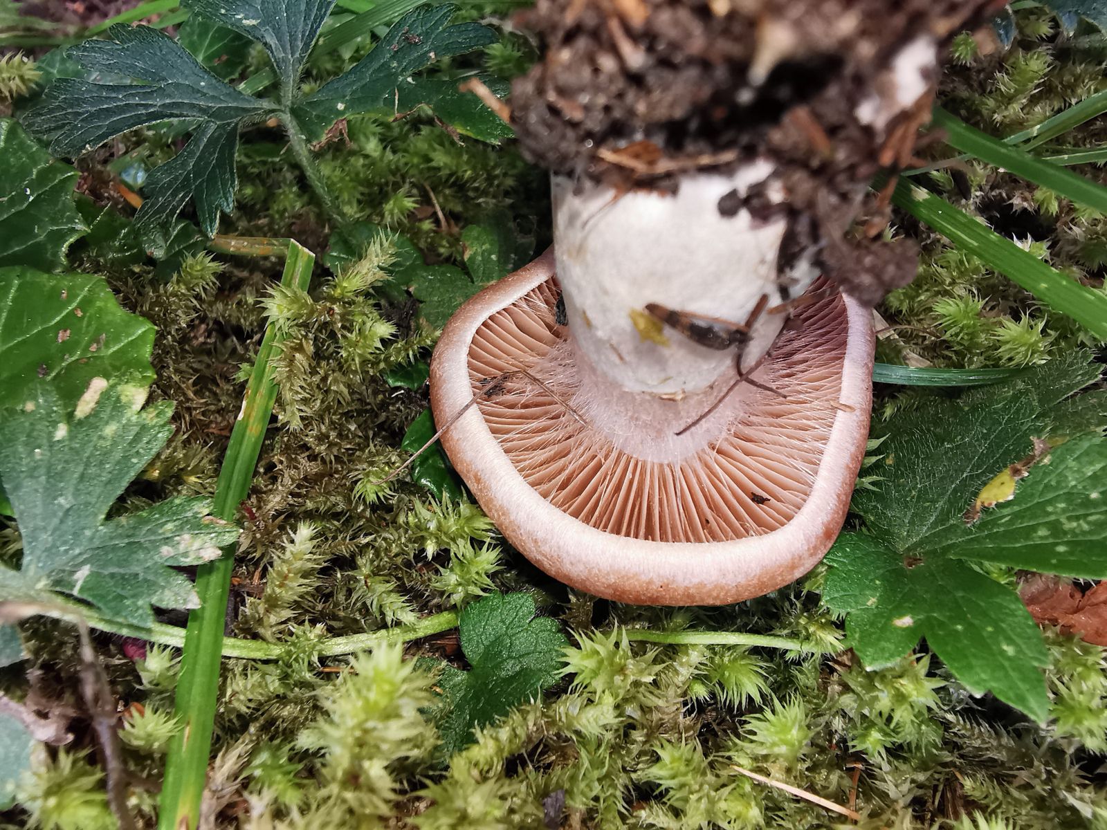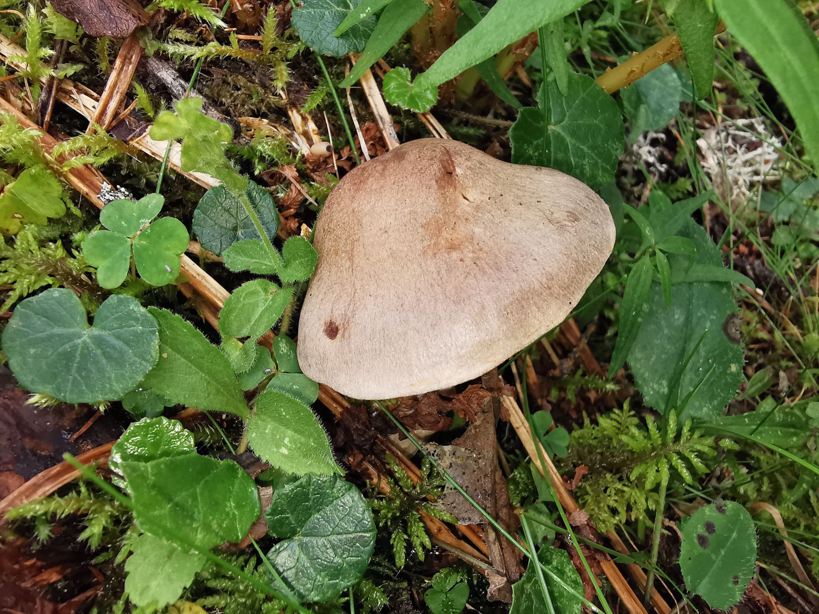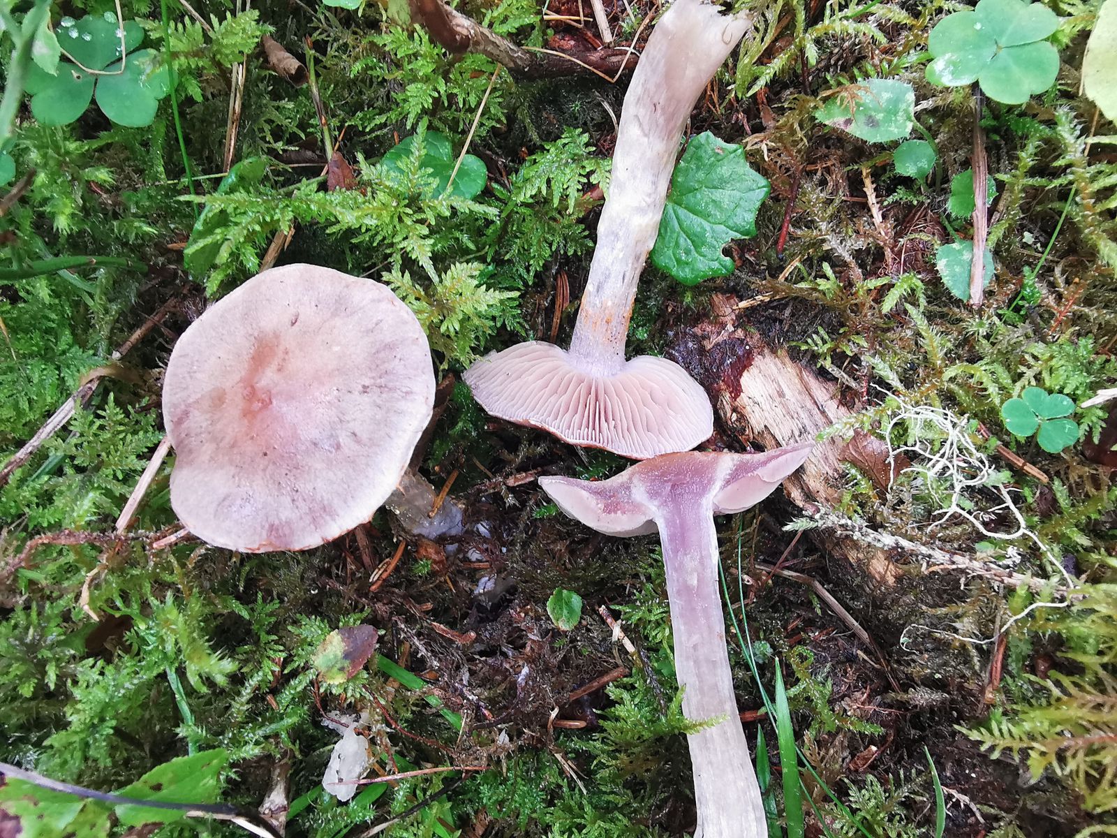 Als nächstes habe ich eine ganze Gruppe braunvioletter bis graubrauner Schleierlinge gesehen. Die Hüte waren oft in der Mitte eher bräunlich und nach aussen hin eher violettlich. Den Geruch empfand ich als ziemlich neutral. Die Lamellen waren bei den jüngeren Exemplaren hellviolett und bei den älteren Exemplaren mehr bräunlich. Meine Vermutung ist hier der Braunviolette Dickfuss - Cortinarius anomalus. Bäume: Fichte
