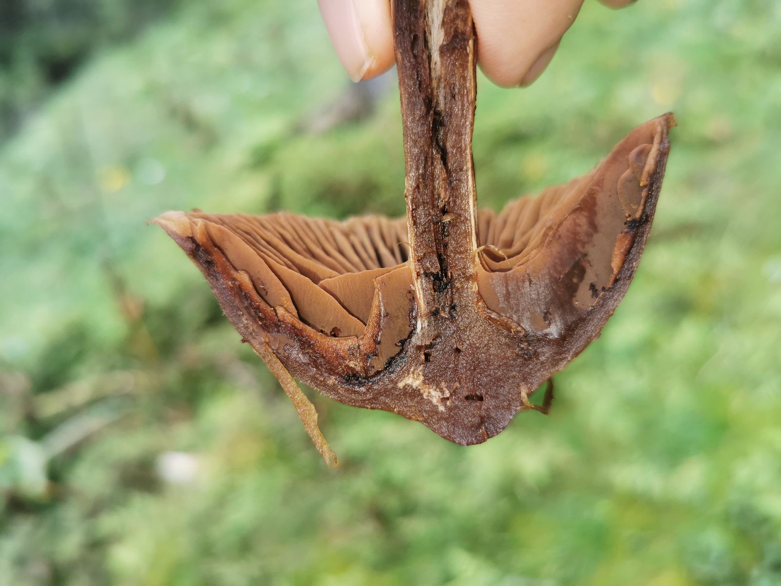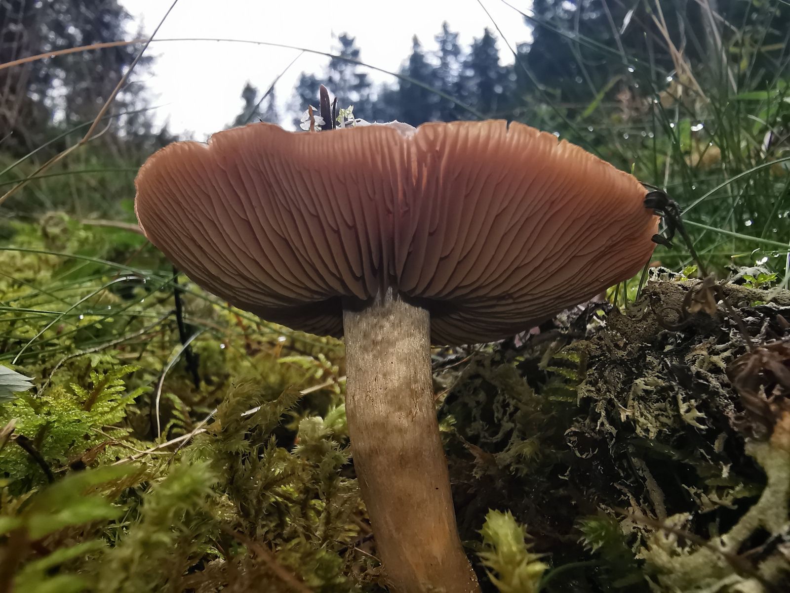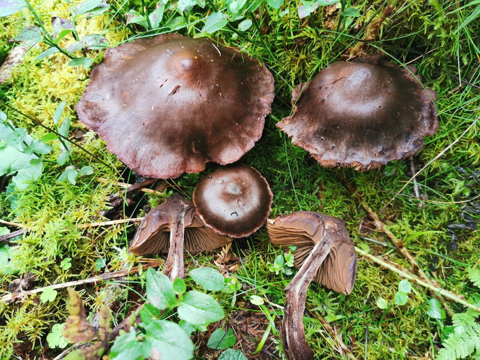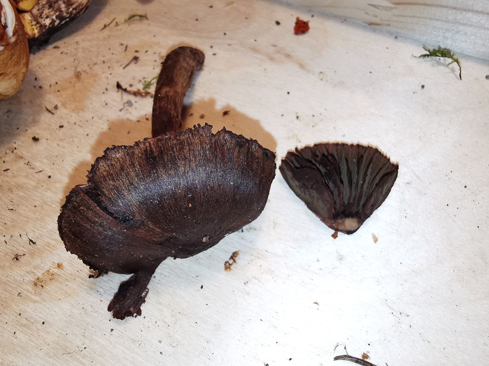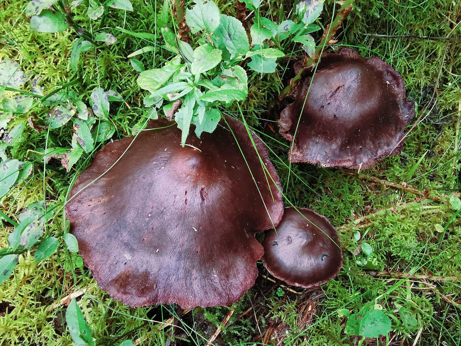 Als nächstes traf ich auf eine Gruppe sehr dunkelbrauner ziemlich grosser Pilze. Ich dachte an Gürtelfüsse - Telemonia. Geruch ziemlich neutral, etwas erdig. Ich habe dann ein paar Gürtelfüsse durchgeschaut, aber irgendwie fand ich keinen, der ganz zu passen scheint. Evtl. der Dunkelbraune Gürtelfuss - Cortinarius brunneus? Was vor allem auch nicht zu passen scheint, ist der Hutdurchmesser, der mit maximal 10cm angegeben wird. Der grosse auf meinen Bildern hatte aber sicher 15cm. Oder kann ein Exemplar auch mal so aus der Reihe tanzen? Die Farben werden hier teilweise leider nicht gerade gut dargestellt. Die Pilze waren durch und durch sehr dunkelbraun. Bäume: Fichte