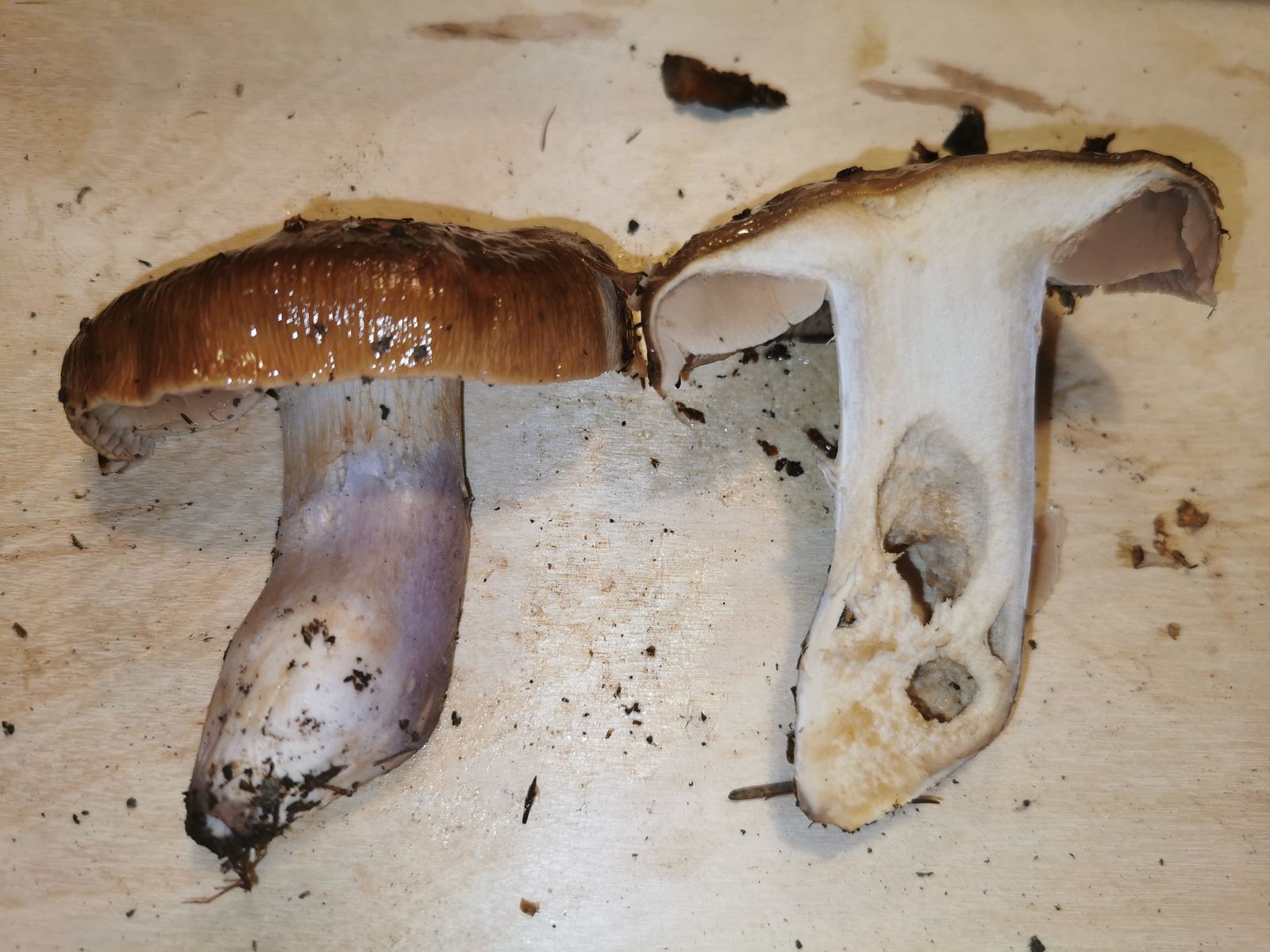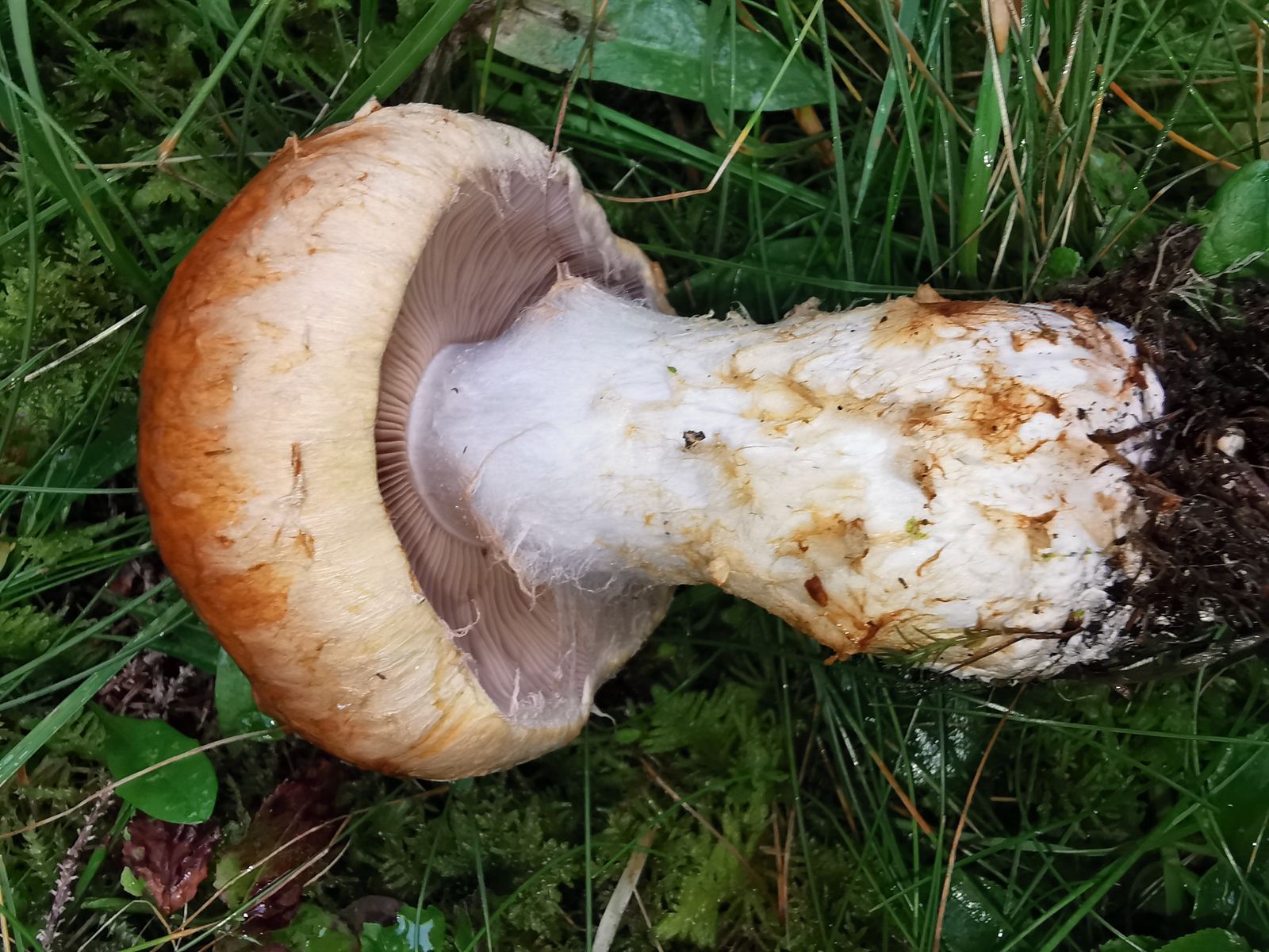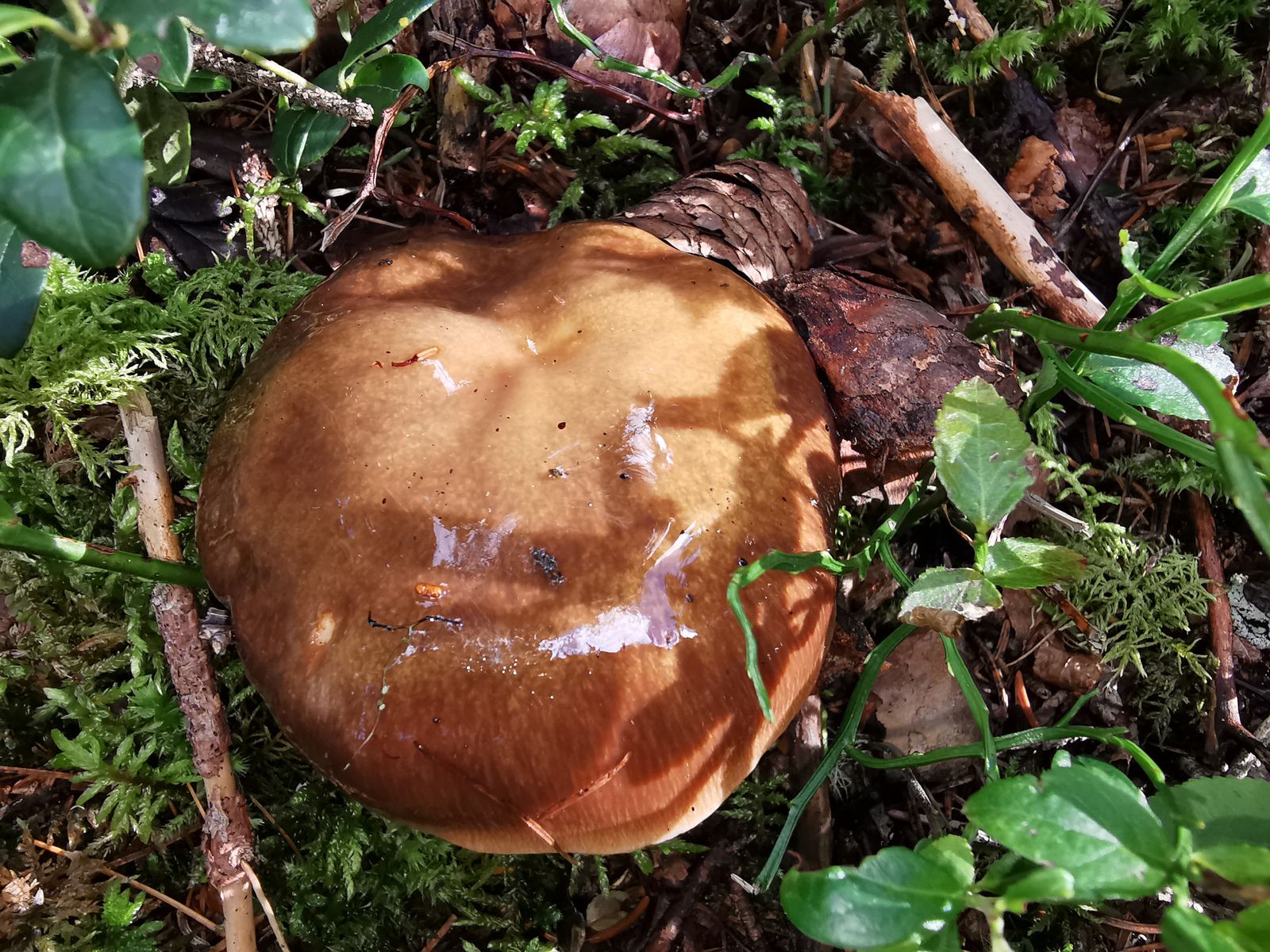Da es bei uns momentan massenweise Goldröhrlinge hat, dachte ich zuerst, das sind auch wieder Goldröhrlinge. Ein genauerer Blick offenbarte dann aber Schleierlinge. Den Geruch empfand ich als ziemlich neutral. Der Hut sieht dem eines Goldröhrlings sehr ähnlich und ist auch sehr schleimig, die Lamellen sind hell cremegrau. Sonst ist mir noch aufgefallen, dass das Fleisch weiss ist, ausser im Hutbereich hat es einen gelblichen Stich. Mit der Pilze 123 App bin ich auf den Sägeblättrigen Klumpfuss - Cortinarius multiformis gekommen. Bin aber unsicher. Bäume: Fichte