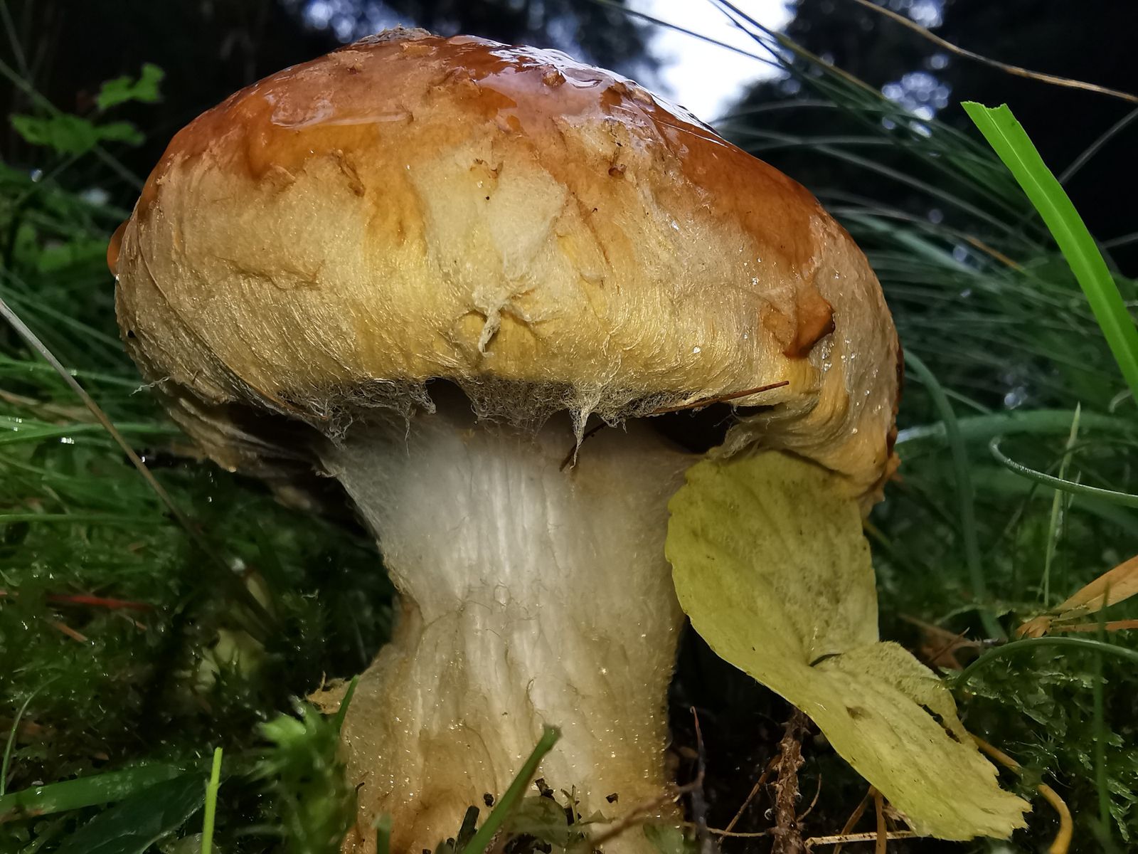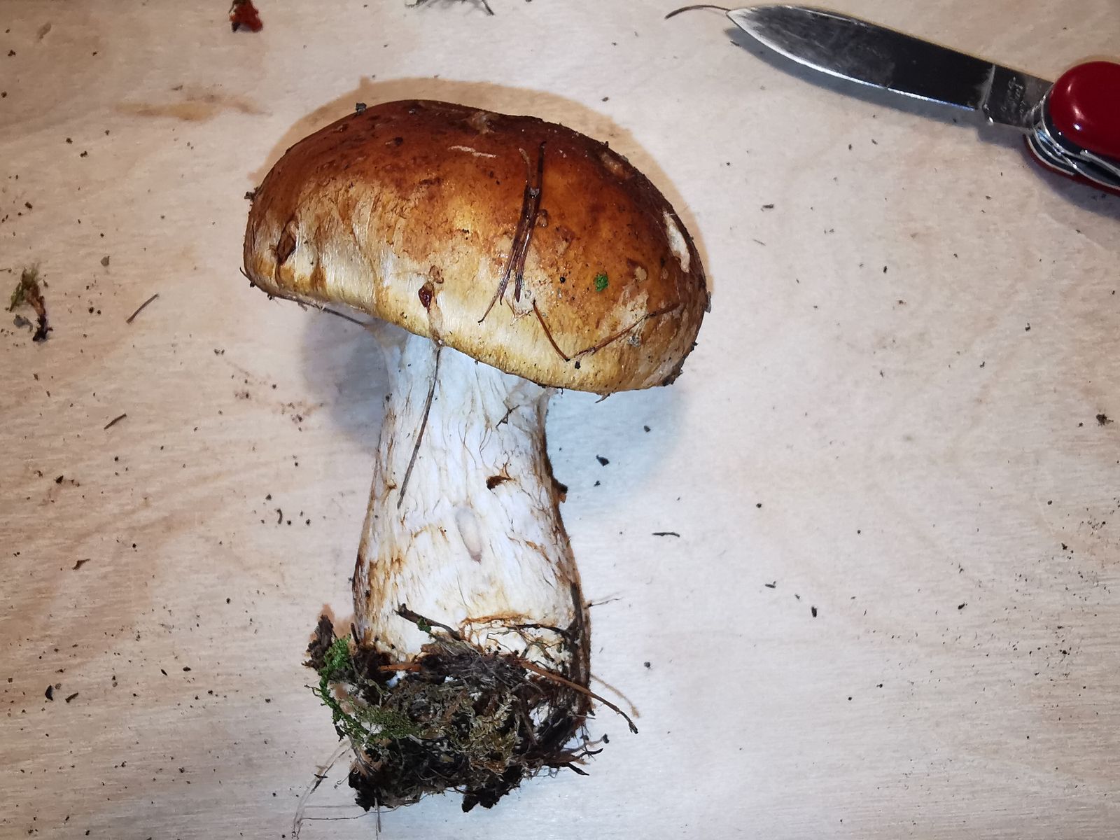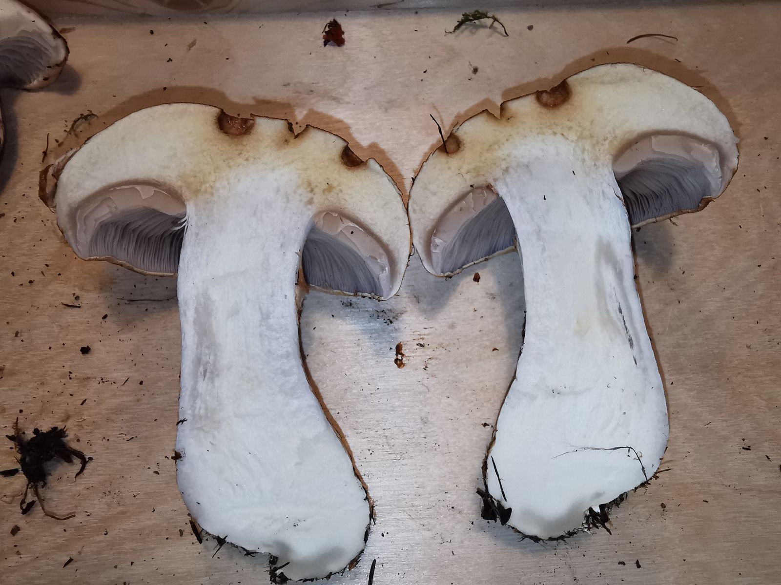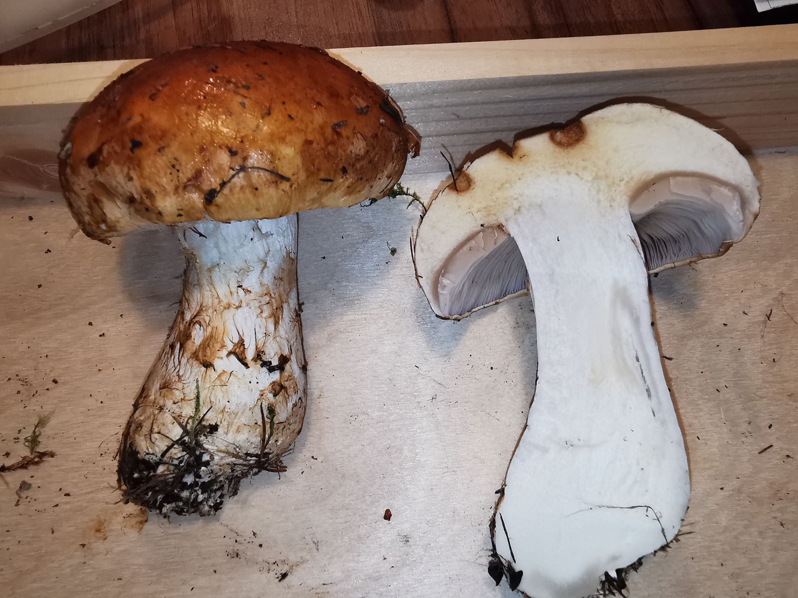 Da es bei uns momentan massenweise Goldröhrlinge hat, dachte ich zuerst, das sind auch wieder Goldröhrlinge. Ein genauerer Blick offenbarte dann aber Schleierlinge. Den Geruch empfand ich als ziemlich neutral. Der Hut sieht dem eines Goldröhrlings sehr ähnlich und ist auch sehr schleimig, die Lamellen sind hell cremegrau. Sonst ist mir noch aufgefallen, dass das Fleisch weiss ist, ausser im Hutbereich hat es einen gelblichen Stich. Mit der Pilze 123 App bin ich auf den Sägeblättrigen Klumpfuss - Cortinarius multiformis gekommen. Bin aber unsicher. Bäume: Fichte