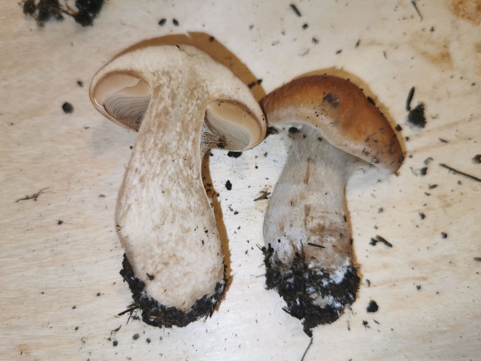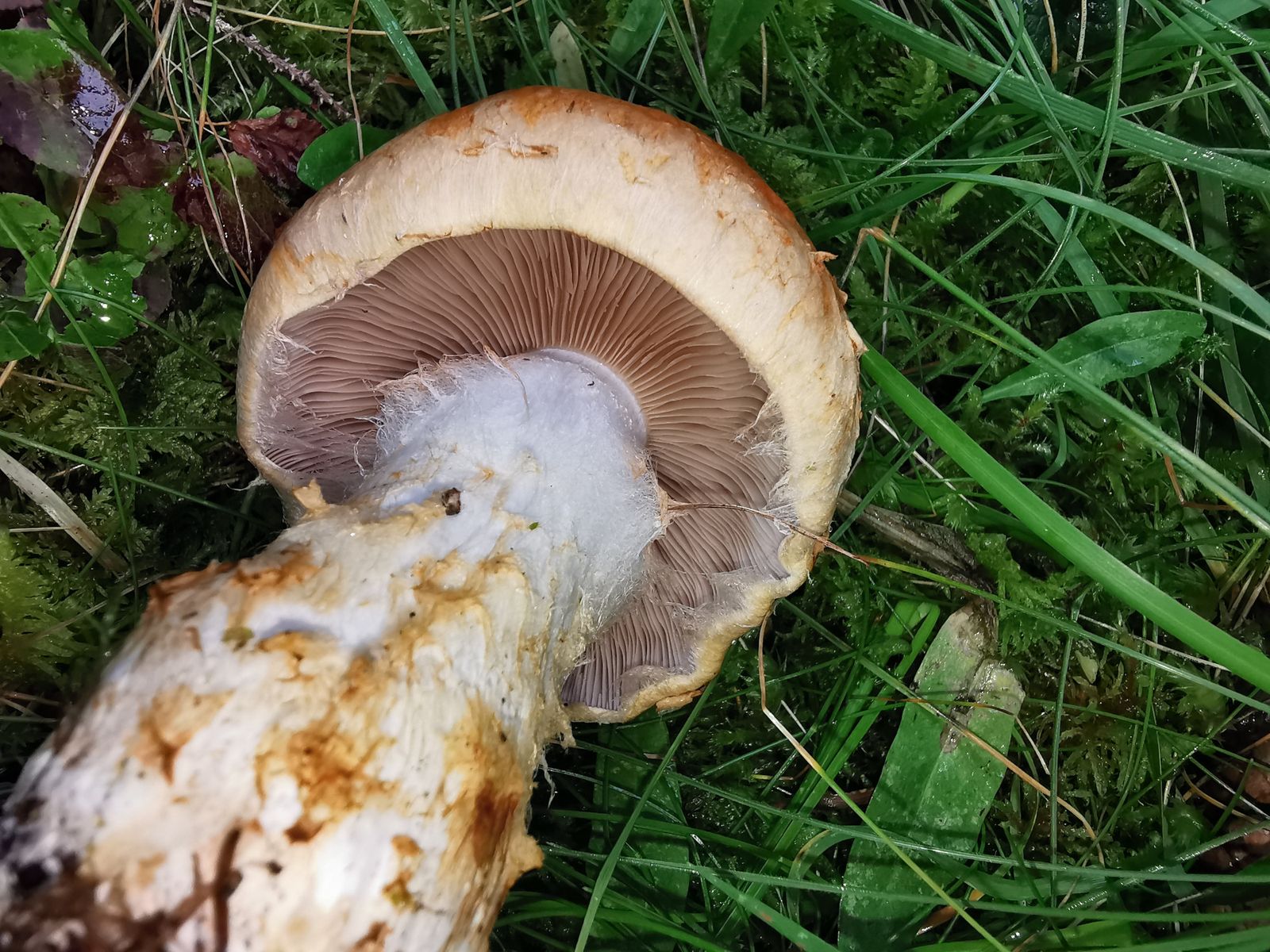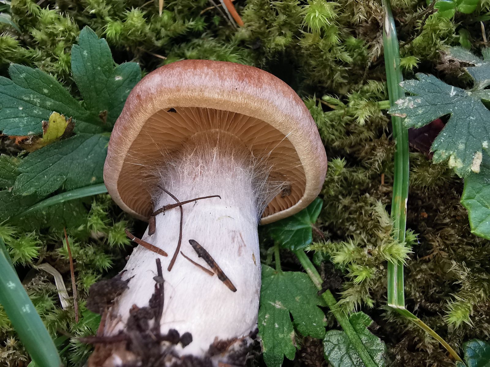Dann habe ich noch einen kleineren Schleierling gefunden. Ockerbräunlicher Hut, Stiel schmutzig weiss bräunlich, Lamellen cremefarben. Das einzige, was evtl. etwas auffällig war, ist, dass sein Fleisch creme bräunlich marmoriert war. Zudem empfand ich den Geruch als etwas unangenehm, kann ihn aber ziemlich schlecht beschreiben, vielleicht ein bisschen, wie ein abgestandener Aschenbecher?