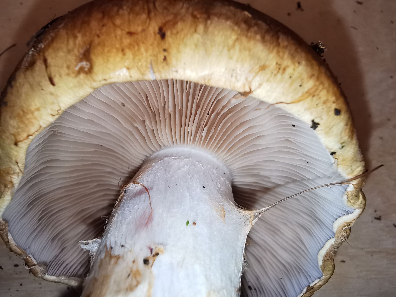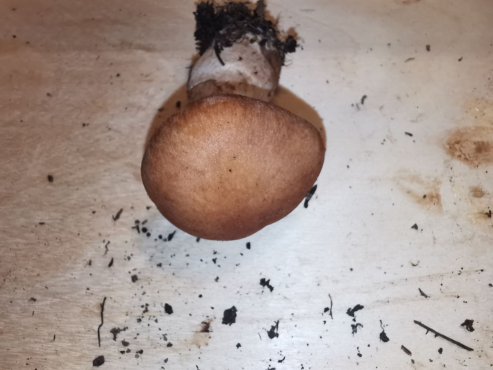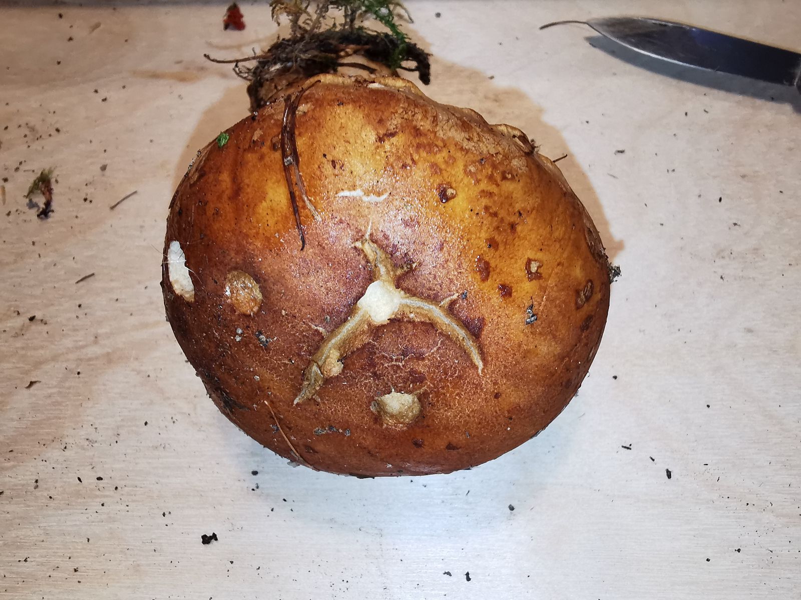 Dann habe ich noch einen kleineren Schleierling gefunden. Ockerbräunlicher Hut, Stiel schmutzig weiss bräunlich, Lamellen cremefarben. Das einzige, was evtl. etwas auffällig war, ist, dass sein Fleisch creme bräunlich marmoriert war. Zudem empfand ich den Geruch als etwas unangenehm, kann ihn aber ziemlich schlecht beschreiben, vielleicht ein bisschen, wie ein abgestandener Aschenbecher?