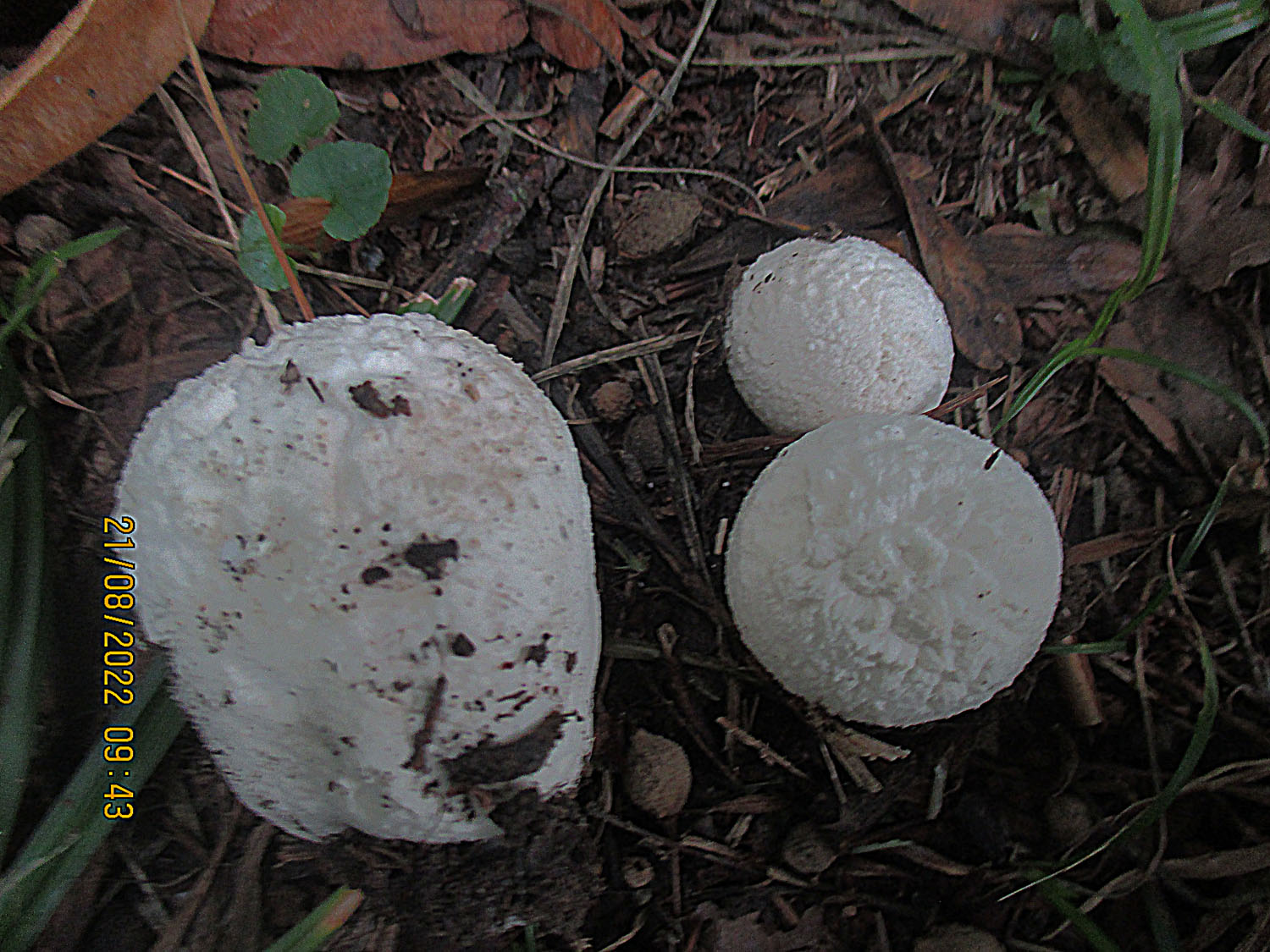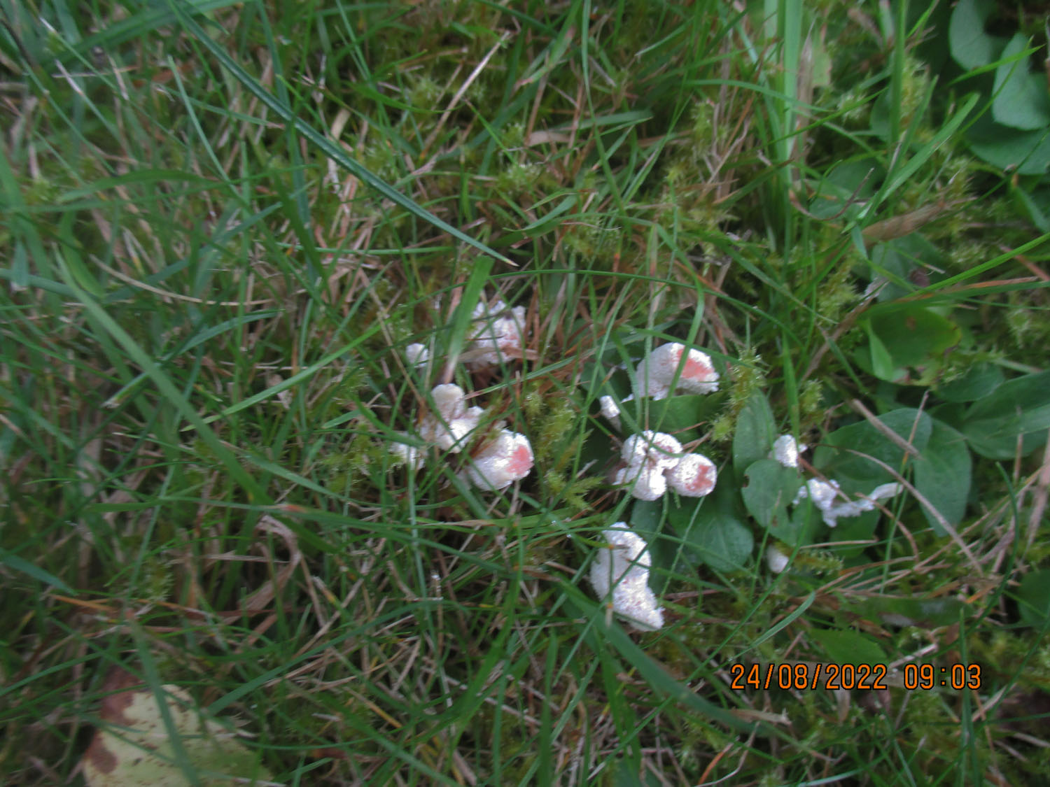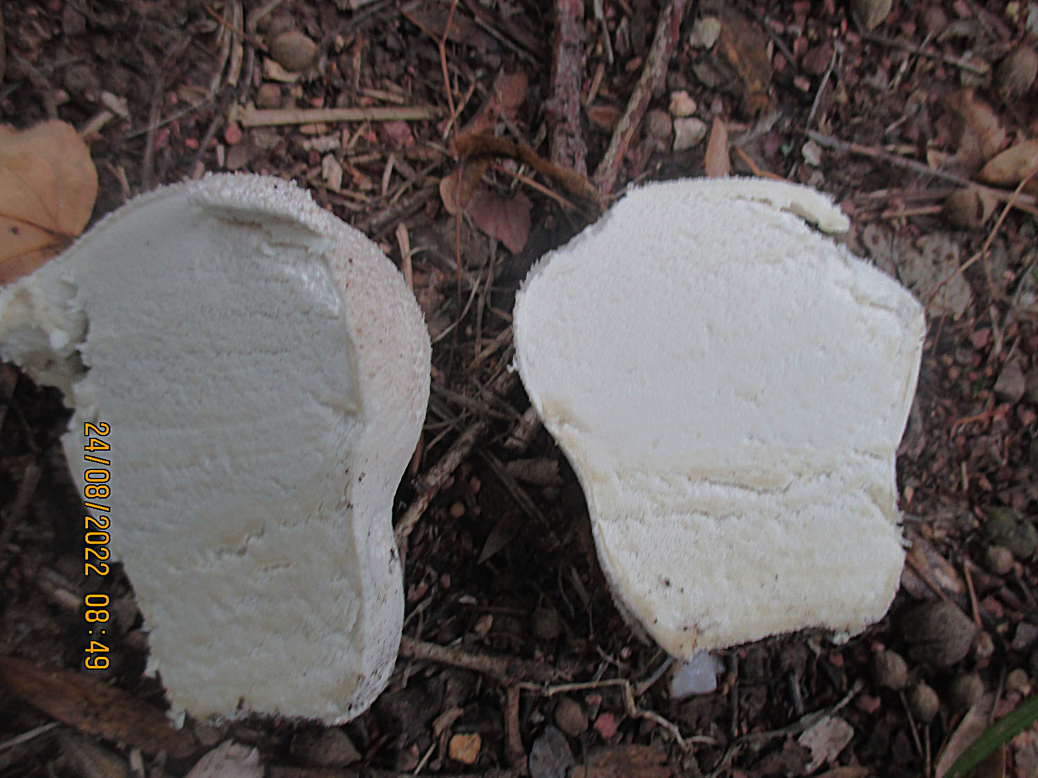 Dann stand ein Trupp von Bovisten herum denen ich keinen Namen geben kann. Für den Hasenbovist (Bovistella utriformis) sind die mir mit 3-5 cm zu klein und für den Bleigrauen Zwegbovist (Bovista plumbea) zu groß. Ich tendiere zum Hasenbovist.