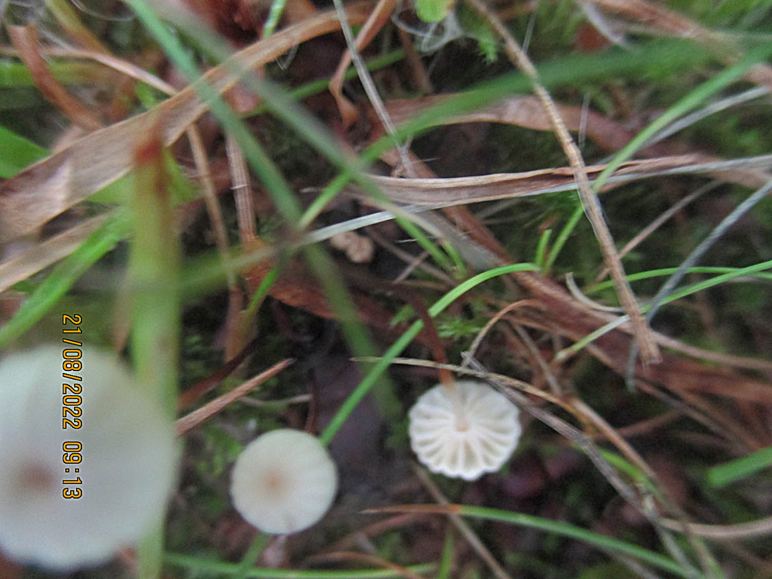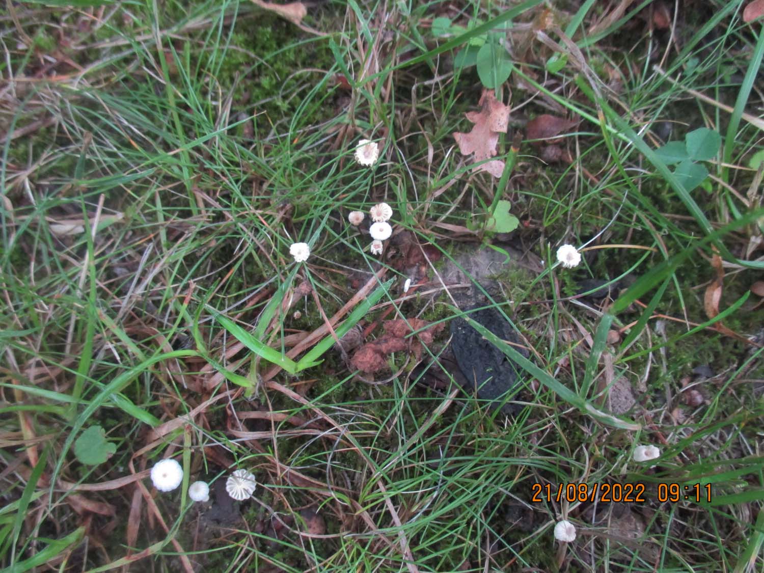 Dann waren im Gras ein paar winzige, weiße Punkte zu sehen die sich als Halsbandschwindlinge (Marasmius rotula) entpuppten. Leider sind die Bilder suboptimal.