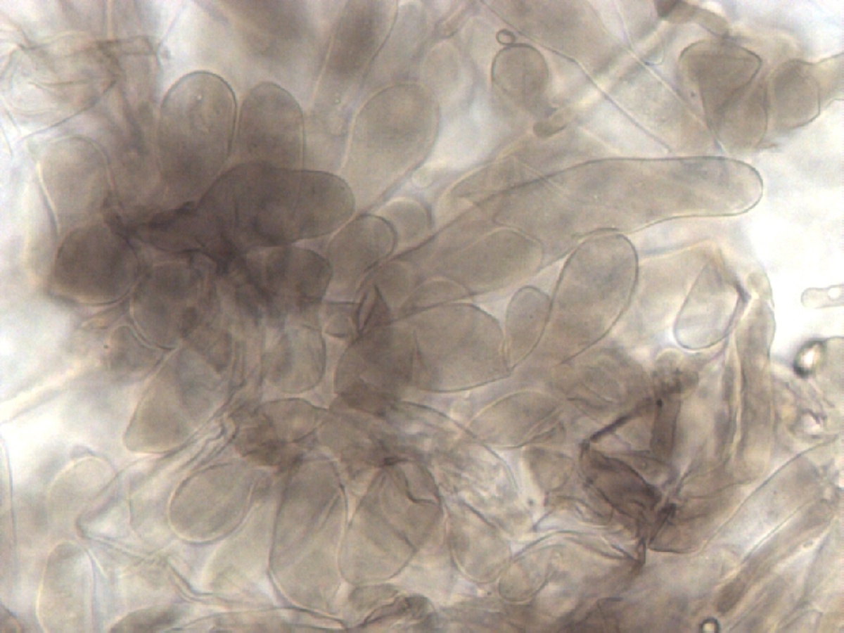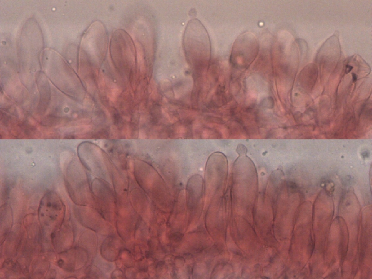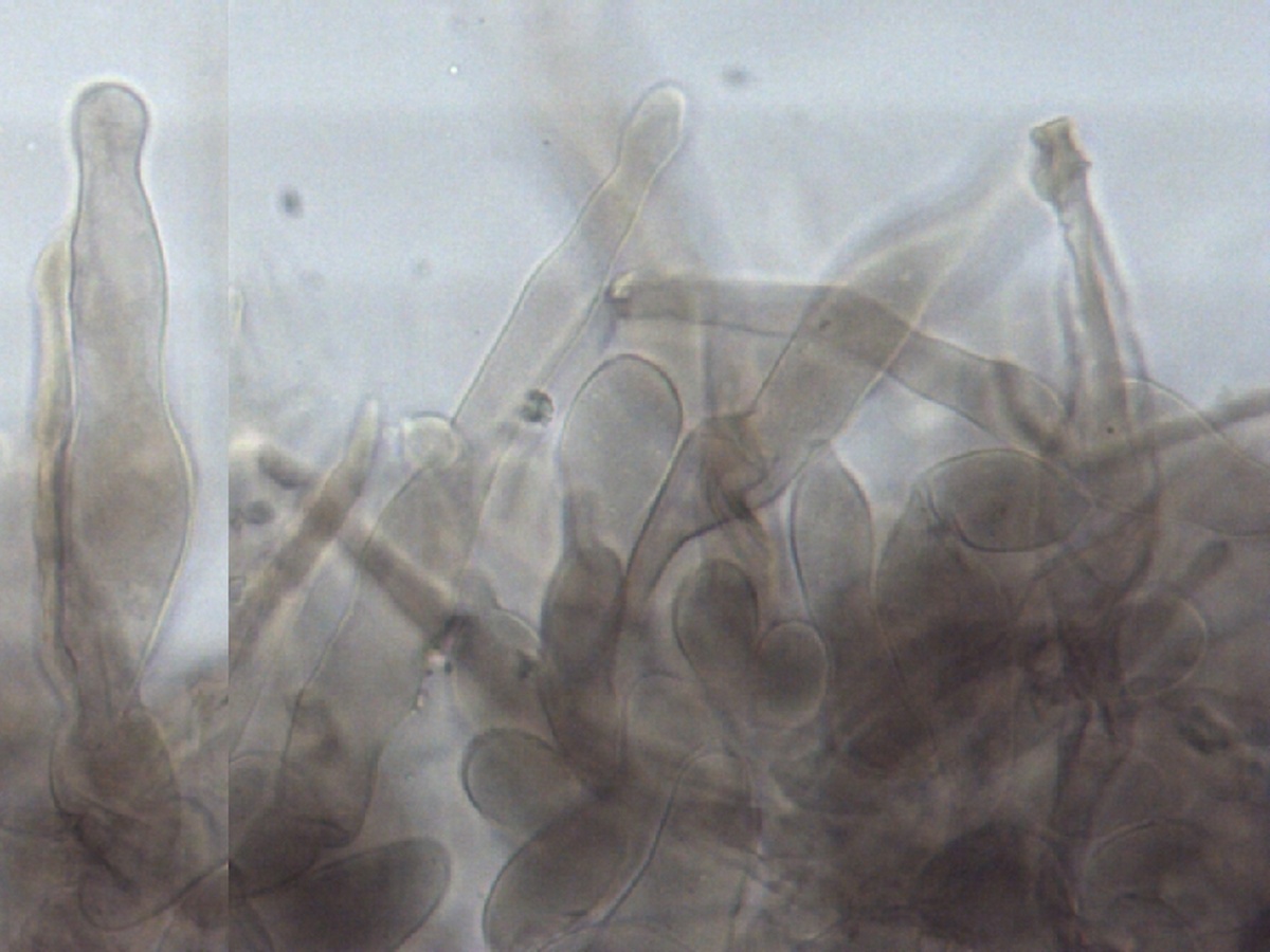 Cheilozystiden: dünnwandig, bauchig mit apikalem dünnem Anhängsel