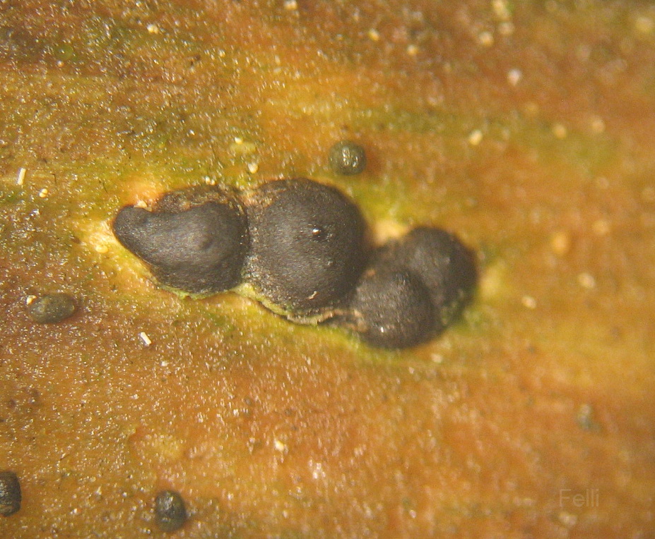 Perithecien 0,7-1,1 mm, in kleinen länglichen Gruppen ( bis zu 5 Einzelperithecien), mammiform, deutliche Papille, schwarz , bis 1/3 im Holz eingesenkt.
