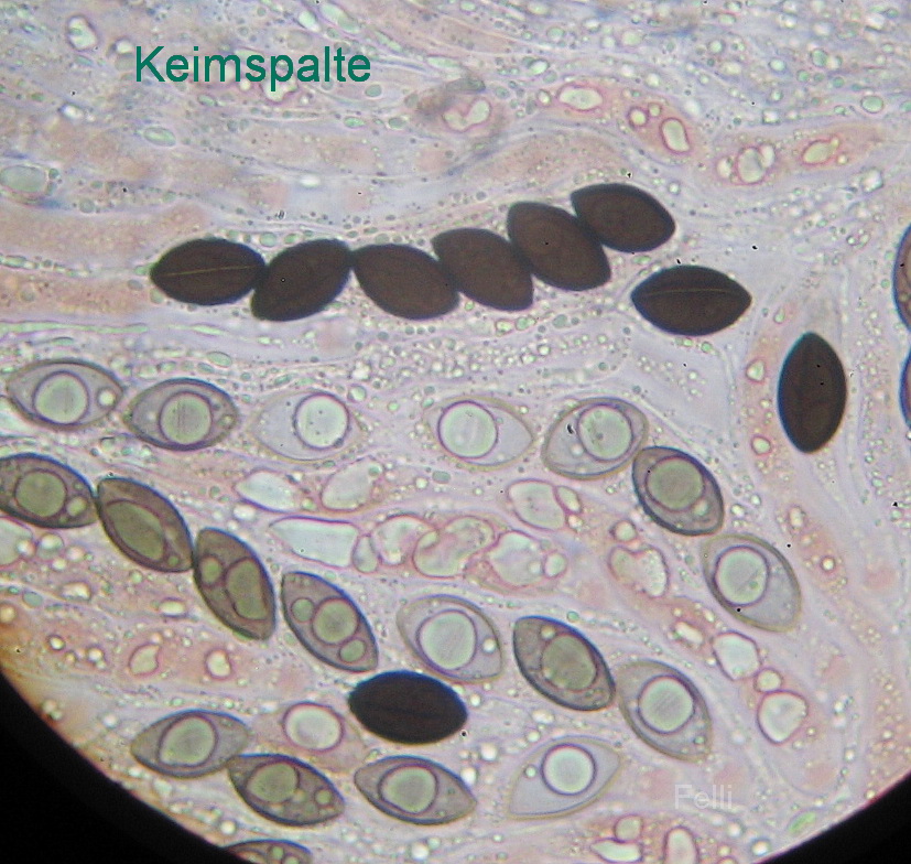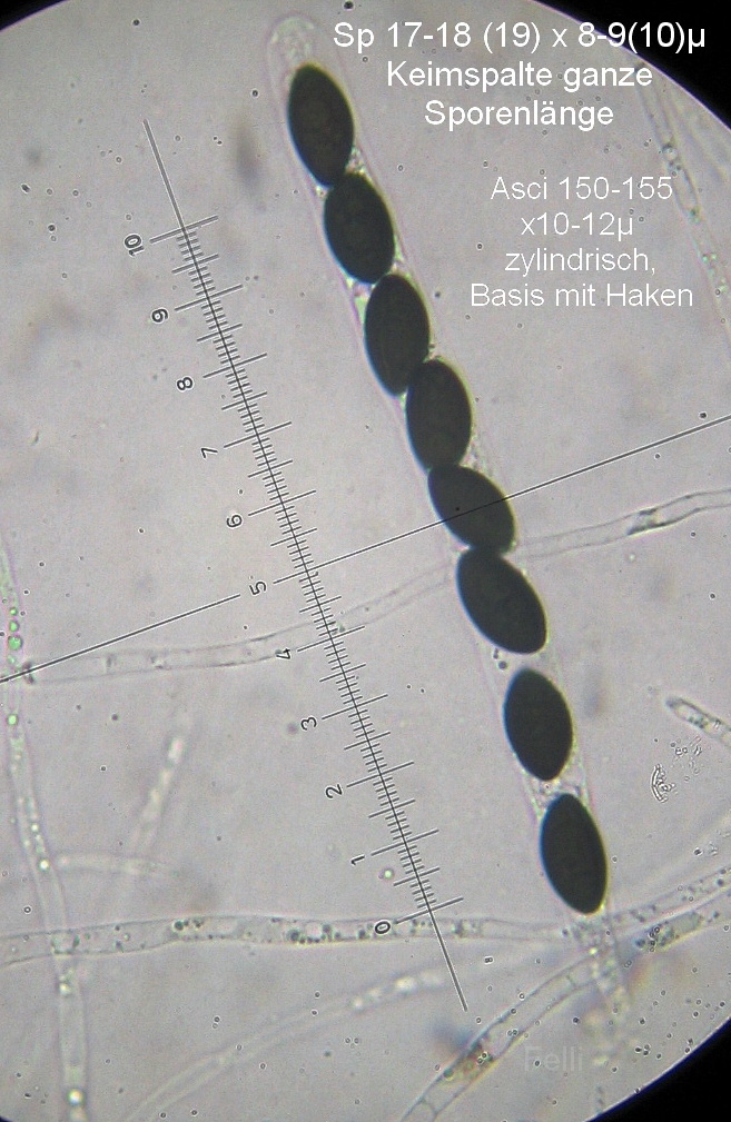 Sporen: (15)17-18 (19) x 8-9(10)µ, dunkelbraun, leicht ungleichseitig, KS über die ganze Sporenlänge.