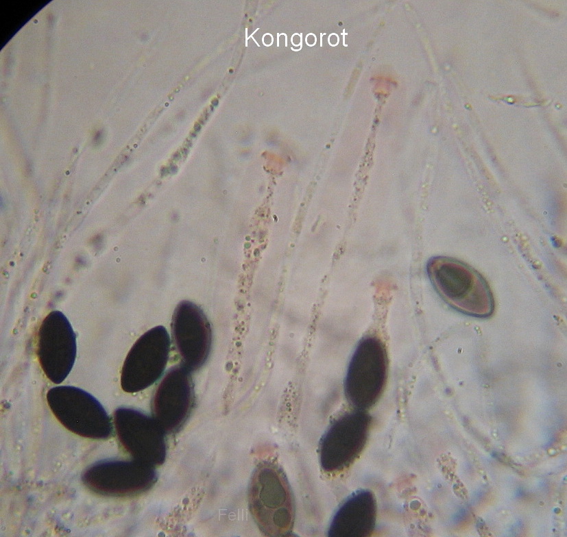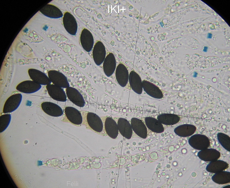 Asci:150 x10-12µ, zylindrisch, 8-sporig, Haken+ , IKI +, leicht kongophil.