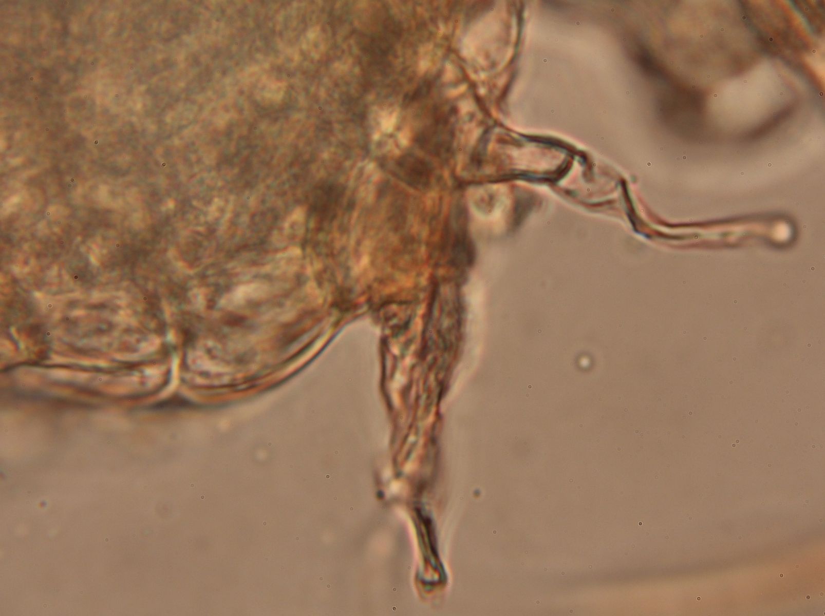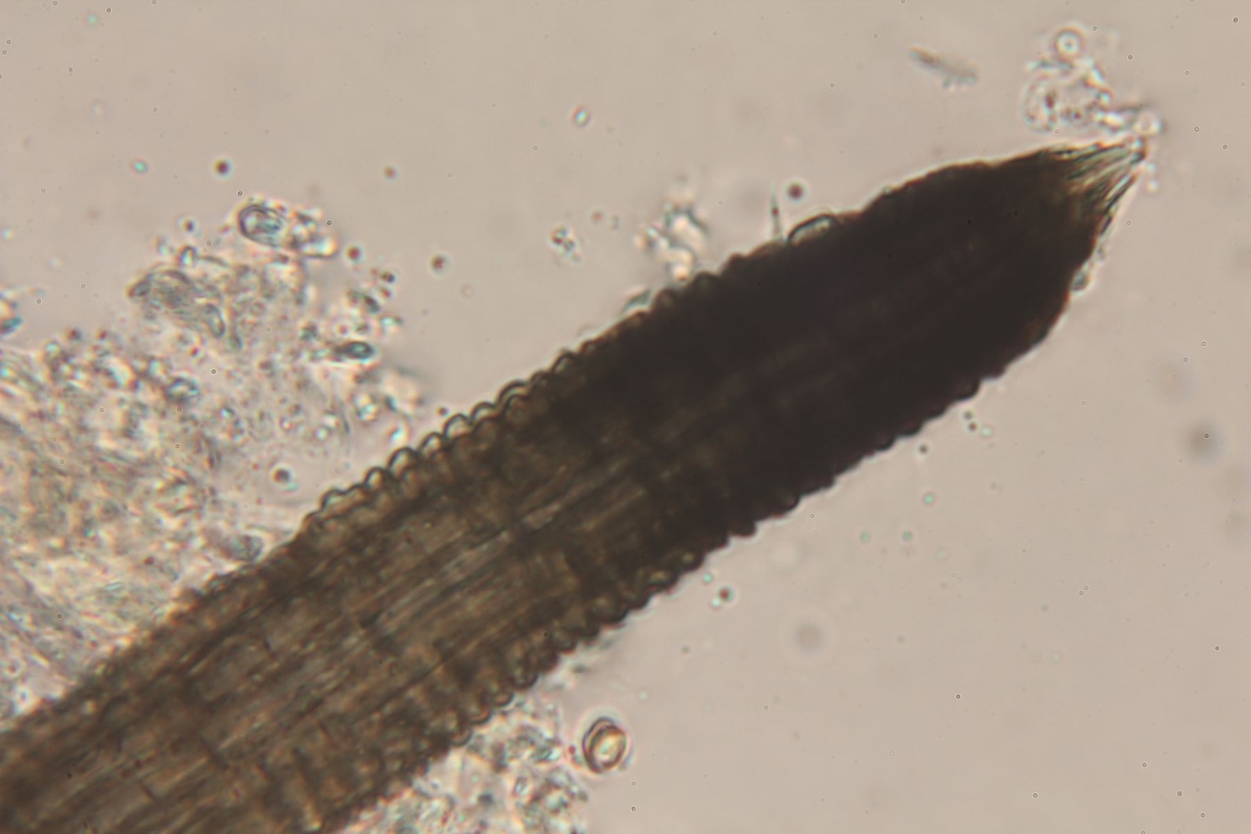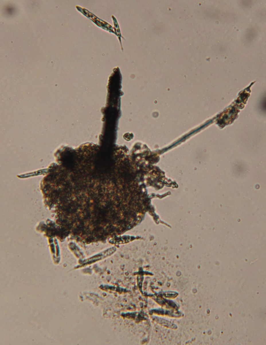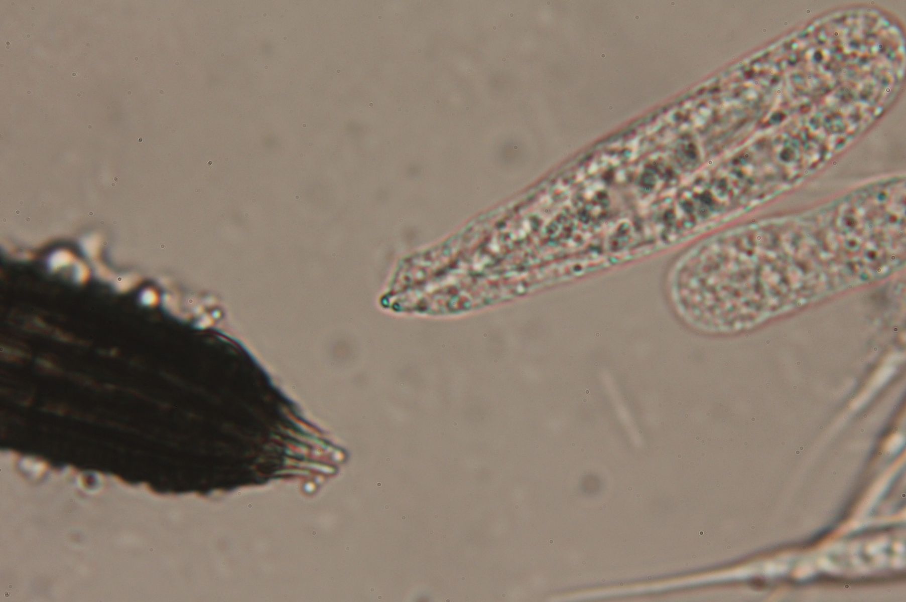 • Auf einem Rinderfladen dominiert nach 3 Wochen noch immer Sporormiella minima. Doch an einer Stelle gibt es andere kleinere Fruchtkörper, die mir erst durch ihren langen dunklen Hals auffallen. Die rundlichen Perithezien sitzen auf oder teilweise leicht im Substrat, sind blass gelblich, semitransparent und haben etwa 90-125µm Ø. Die äußeren Bauchzellen messen bis zu 21 x 16µm (Text.globulosa-angularis). Auf ihnen sitzen einige hyaline Haare. Der etwa 150-175 x 20µm lange Hals ist dunkelbraun und runzelig-gerippt, was mich formmäßig ein wenig an einen braunen Maiskolben erinnert. Er setzt sich aus mehreren Reihen zylindrischer Zellen zusammen. Basal ist er etwas erweitert und spitzt apikal mehr zu. In den Fruchtkörpern sind keine Paraphysen vorhanden. Die keuligen Asci sind einwandig (unitunikat), Jod-, und 3sporig! (was mir auch neu ist). Die Ascus-Größe ist mit ca. 52 x 12µm nicht größer als die Sporen selbst, die ich bis zu 53 x 5µm gemessen habe. Diese haben im unteren Drittel des Sporenkörpers eine Septe. Vermutlich sind meine Findlinge noch etwas zu jung, um auch eine mögliche 2. Septe zu finden, ebenso einen "braunen Fleck" im subapikalen Sporenbereich.