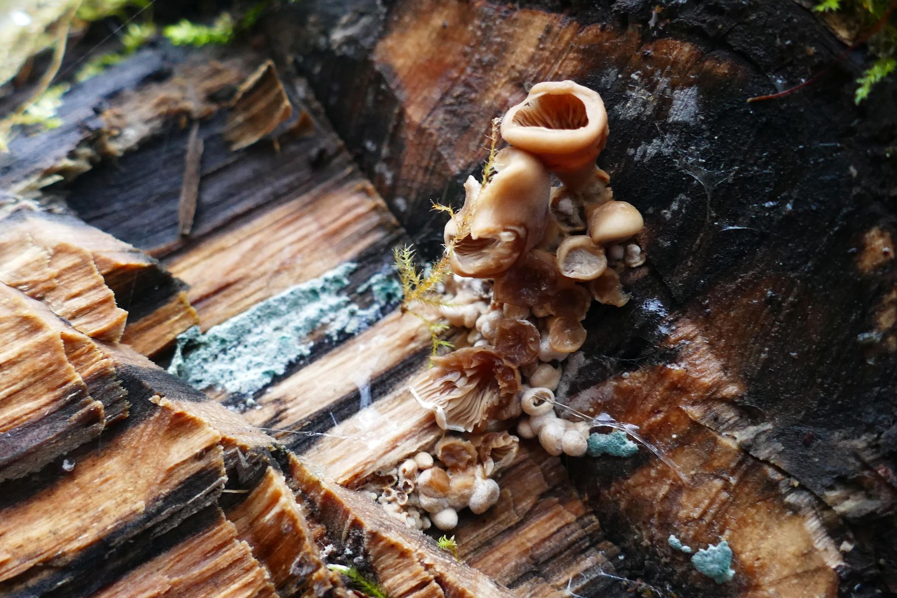 Am gleichen Baumstamm, nicht weit entfernt, wuchsen schneeweiße Pilzchen.