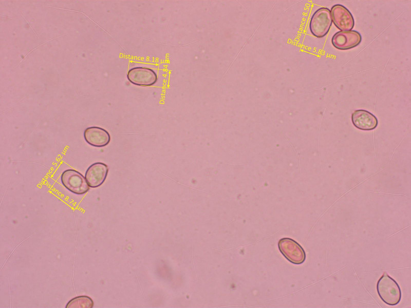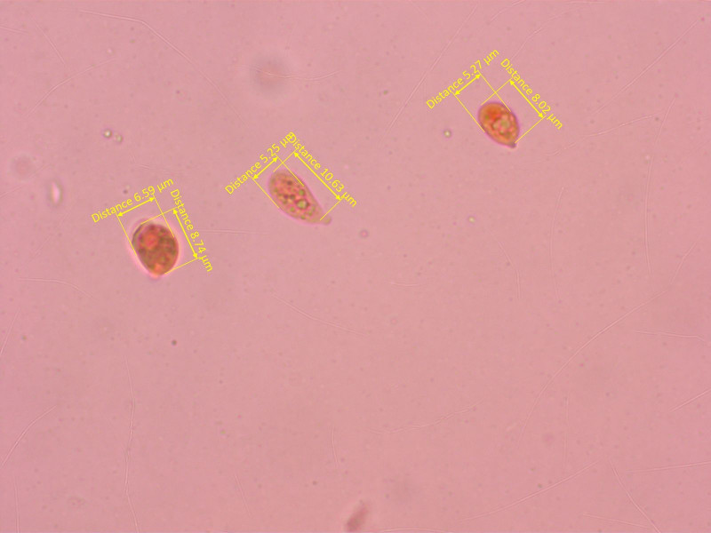 Sporen mehrheitlich über 8 µm lang, womit Volvariella murinella aus dem Spiel ist. Auch das Habitat und das parasitische Wachstum passen nicht zu murinella.