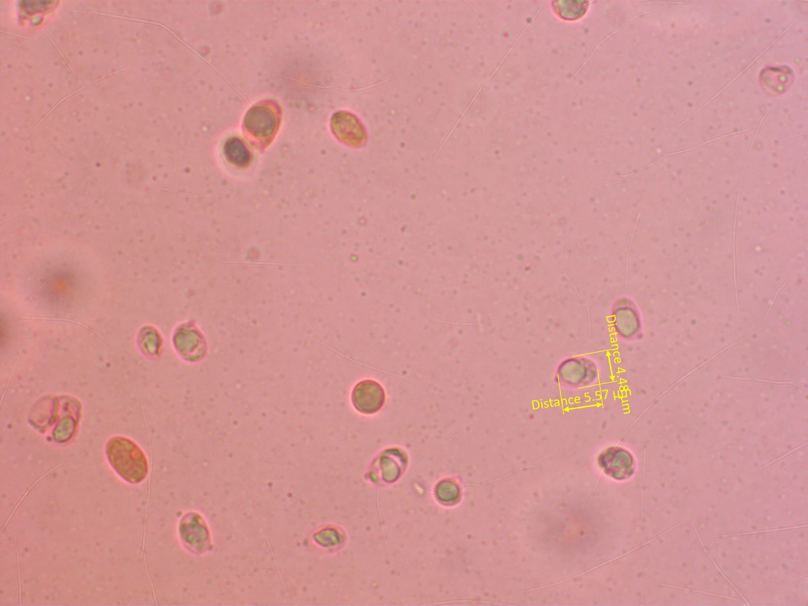 Sporen mehrheitlich über 8 µm lang, womit Volvariella murinella aus dem Spiel ist. Auch das Habitat und das parasitische Wachstum passen nicht zu murinella.