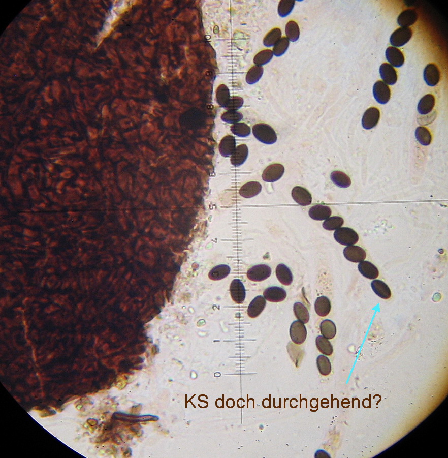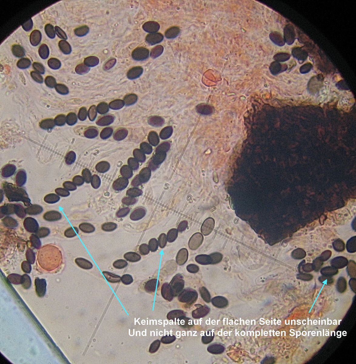 Sporen: 5-7(8) x4-5 x 3-3,5 µ, Keimspalte auf der flachen Seite der Sporen nur unscheinbar nur f a s t